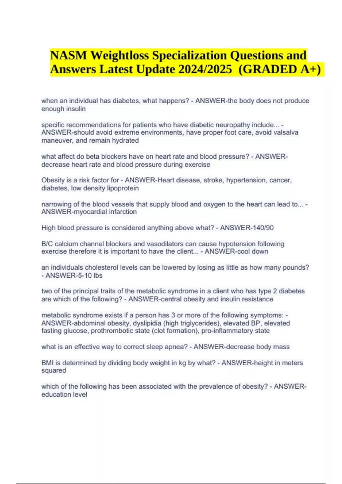 NASM Weightloss Specialization Questions and Answers Latest Update 2024/2025 (GRADED A+) when an individual has diabetes, what happens? - ANSWER-the body does not produce enough insulin specific recommendations for patients who have diabetic neuropathy include... - ANSWER-should avoid extreme environments, have proper foot care, avoid valsalva maneuver, and remain hydrated what affect do beta blockers have on heart rate and blood pressure? - ANSWERdecrease heart rate and blood pressure during exercise Obesity is a risk factor for - ANSWER-Heart disease, stroke, hypertension, cancer, diabetes, low density lipoprotein narrowing of the blood vessels that supply blood and oxygen to the heart can lead to... - ANSWER-myocardial infarction High blood pressure is considered anything above what? - ANSWER-140/90 B/C calcium channel blockers and vasodilators can cause hypotension following exercise therefore it is important to have the client... - ANSWER-cool down an individuals cholesterol levels can be lowered by losing as little as how many pounds? - ANSWER-5-10 lbs two of the principal traits of the metabolic syndrome in a client who has type 2 diabetes are which of the following? - ANSWER-central obesity and insulin resistance metabolic syndrome exists if a person has 3 or more of the following symptoms: - ANSWER-abdominal obesity, dyslipidia (high triglycerides), elevated BP, elevated fasting glucose, prothrombotic state (clot formation), pro-inflammatory state what is an effective way to correct sleep apnea? - ANSWER-decrease body mass BMI is determined by dividing body weight in kg by what? - ANSWER-height in meters squared