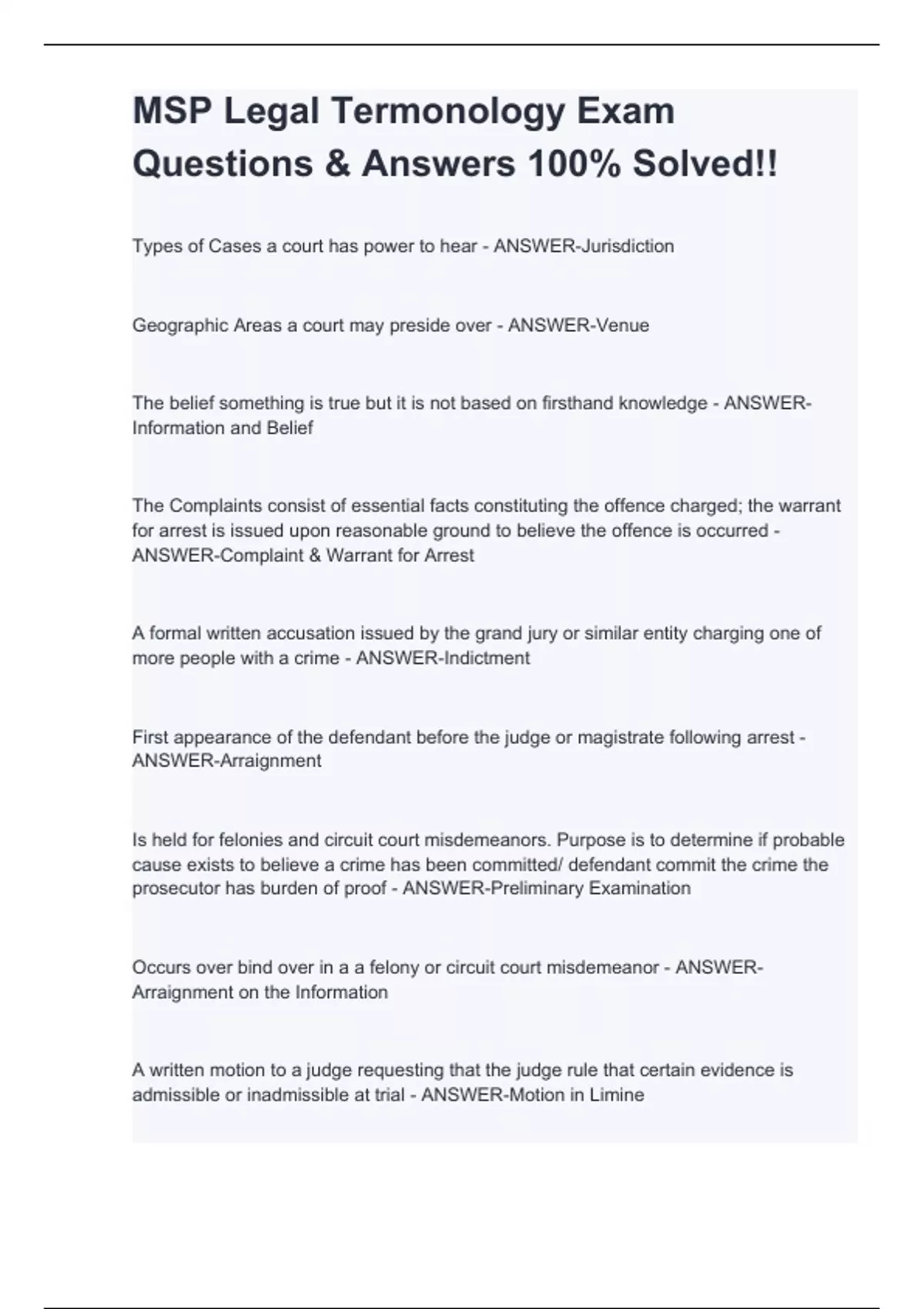 MSP Legal Termonology Exam Questions & Answers 100% Solved!!