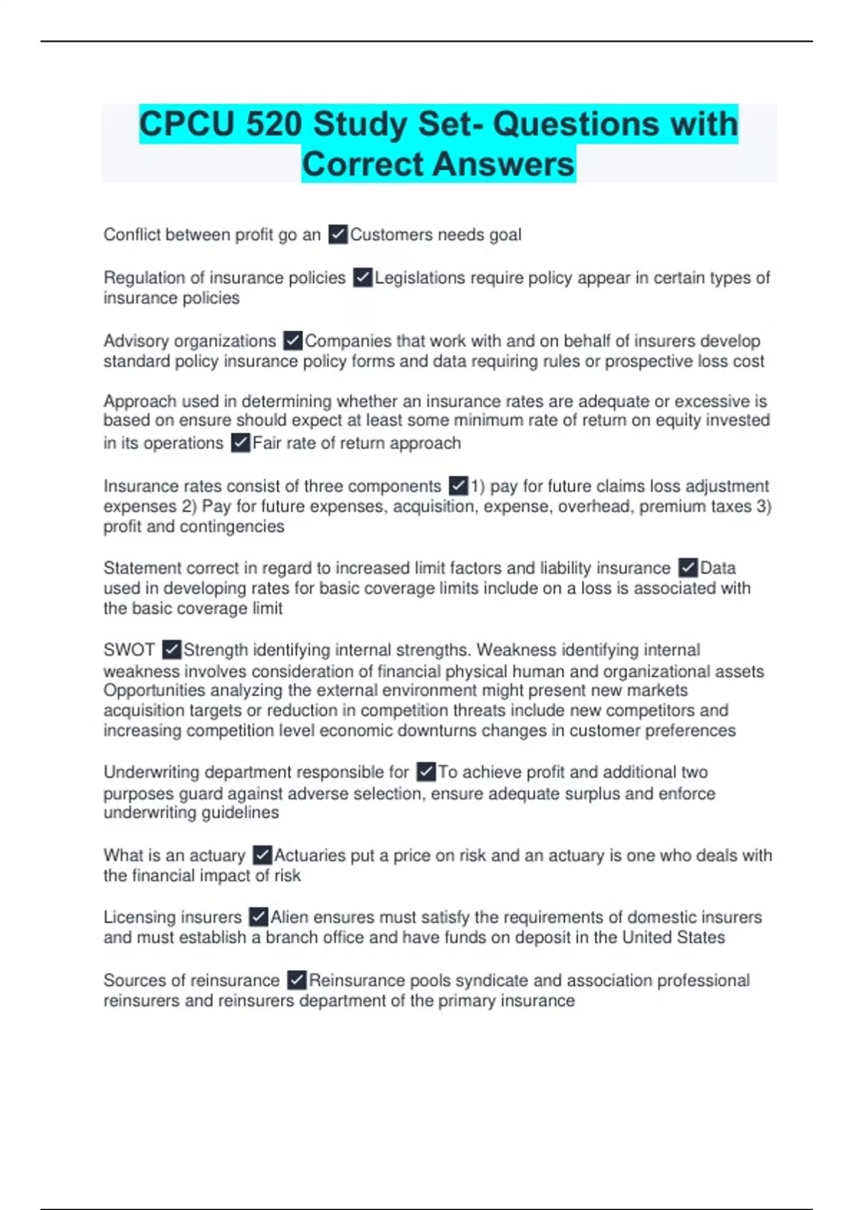 CPCU 520 Study Set- Questions with Correct Answers