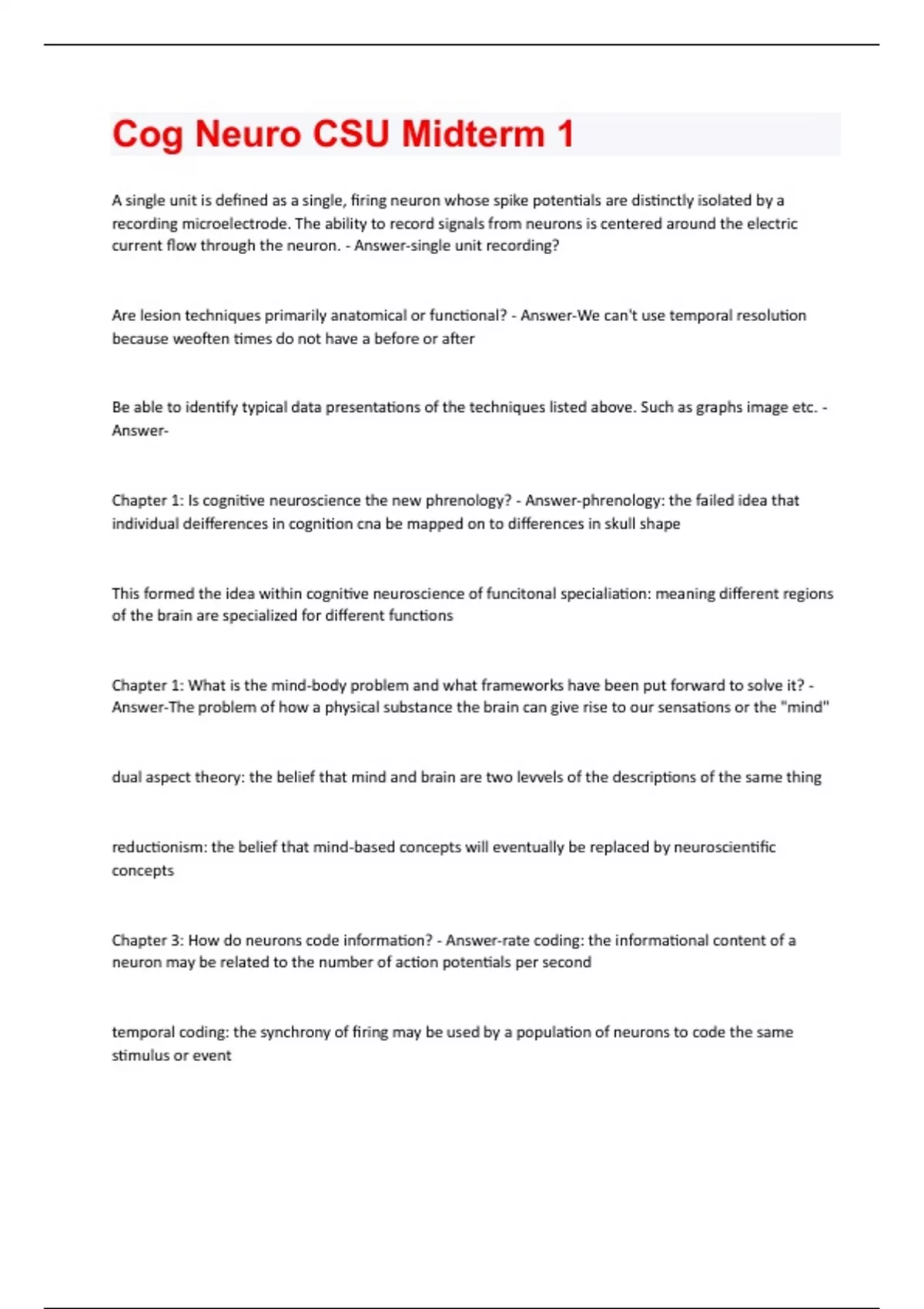 A single unit is defined as a single, firing neuron whose spike potentials are distinctly isolated by a recording microelectrode. The ability to record signals from neurons is centered around the electric current flow through the neuron. - Answer-single unit recording? Are lesion techniques primarily anatomical or functional? - Answer-We can't use temporal resolution because weoften times do not have a before or after Be able to identify typical data presentations of the techniques listed above. Such as graphs image etc. - AnswerChapter 1: Is cognitive neuroscience the new phrenology? - Answer-phrenology: the failed idea that individual deifferences in cognition cna be mapped on to differences in skull shape This formed the idea within cognitive neuroscience of funcitonal specialiation: meaning different regions of the brain are specialized for different functions Chapter 1: What is the mind-body problem and what frameworks have been put forward to solve it? - Answer-The problem of how a physical substance the brain can give rise to our sensations or the "mind" dual aspect theory: the belief that mind and brain are two levvels of the descriptions of the same thing reductionism: the belief that mind-based concepts will eventually be replaced by neuroscientific concepts Chapter 3: How do neurons code information? - Answer-rate coding: the informational content of a neuron may be related to the number of action potentials per second temporal coding: the synchrony of firing may be used by a population of neurons to code the same stimulus or eventChapter 3: What have electrophysiological studies contributed to our understanding of how faces are represented and processed by the brain? - Answer-Neurons in the temporal corext of monkeys respond to certain faces. Ex: grandmother cell, there is only one cell that reponds to a picture of your grandmother. Chapter 3: What is an event related potential (or ERP) and how can it be used to inform theories of cognition? - Answer--The average amount of change in voltage at the scalp that are linked to the timing of particular cognitive events - Basically, it informs us on how different cognitive processes can be effected through timing Chapter 4: • What are the physiological processes that underpin fMRI? What determines the spatial and temporal resolution of this methods? - Answer-fMRI is based on hemodynamics, or how blood flows through the brain. Blood flows to active regions of the brain. The temporal resolution is low because of the speed of the movement of blood in comparison to electrical signals. Spatial resolution is better than EEGs and MEGs because Spatial resolution is determined by voxel size. chapter 4: Could functional imaging be used in lie detection? Could it be used to read someone else's thoughts and feelings? - Answer-Yes. Patterns of activity can tell us with 96% accuracy what a person is seeing, thinking about, etc. However, when it comes to lying, there is no specific region of the brain that tell us someone is lying. It's more about understanding the function of areas. Chapter 4: if a brain region is shown to be"active" in a given task, does it mean that this region is critical for performing the task? If not, why not? - Answer-Blood flows to both excited and inhibited regions of the brain. Both are active, however, inhibited regions of the brain are not critical for performing a task. Chapter 4: Is functional imaging ever likely to completely replace lesion methods for informing theories of cognition? - Answer-No, because lesion methods often conflict with functional imaging. Lesion methods show us whether a region of the brain is critical for functioning, while functional imaging only shows us /if/ it is used in a process and why, not whether it has to be used. Chapter 4: What is meant by the method of "cognitive subtraction" in functional imaging research? What problems does this method face? - Answer-look at difference for stimuli versus baselineChapter 5: • What assumptions must one accept to be able to draw inferences about normal cognition from adults with brain damage? Are these assumptions plausible? - Answer-the fractionation assumption (damage to the brain can produce selective cognitive lesions) the transparency assumption (lesions do not result in a completely new cognitive system), universality assumption (all cognitive systems are identical); these assumptions are all somewhat plausible depending most on the situation; for example, the transparency assumption is most problematic because the brain is very plastic (therefore this assumption stands true much more in the case of brain damage acquired in adulthood versus childhood) Chapter 5: Compare and contrast lesion methods arising from organic brain damage with TMS. - AnswerTMS: can be used to detmine timing of cognition, lesions can be moved within the same participant, and we can stuy functional integration Organic Lesions over TMS: subcortical lesions can be studied, lesions can be accuratley localized with MRI, changes in behavior and cognition are more apparemt Chapter 5: Critically evaluate the role of group studies in neuropsychological research. - Answer-Group studies can tell us if a given region is needed to preform a task Single studies are argued for because of the specificity of the individual brain- especially lesions chapter 5: How have TMS and tDCS studies contributed to our knowledge of brain plasticity? - Answerusing magnetic fields and electricity you can spark cells to become alive again and change brain function. Allow us to correct brain damage. chapter 5: What are the advantages and disadvantages of using single cases to draw inferences about normal cognitive functioning? - Answer-advantages: single case studies constitute valid data with which to test, amend, and develop theory; particular cases CAN be generalized to normal cognition, but not as easily to another single caseDISadvantages: one cannot create a theory based on a single case ER