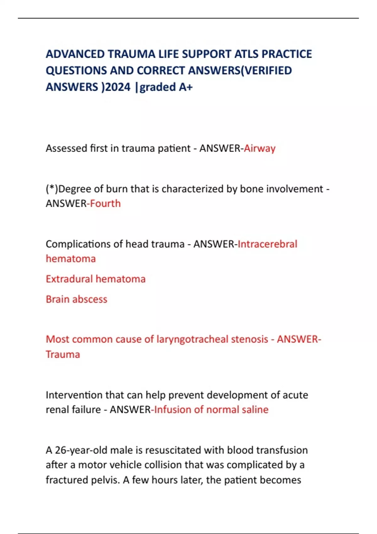 ADVANCED TRAUMA LIFE SUPPORT ATLS PRACTICE QUESTIONS AND CORRECT ANSWERS(VERIFIED ANSWERS )2024 |graded A+