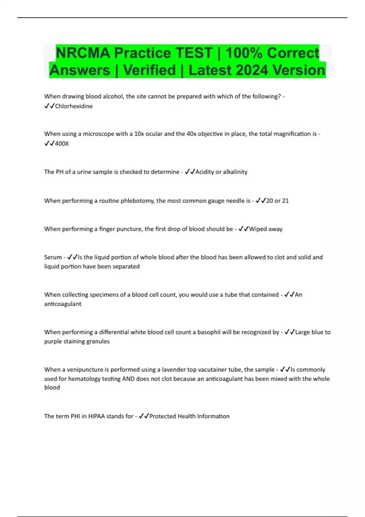 NRCMA Practice TEST | 100% Correct Answers | Verified | Latest 2024 Version