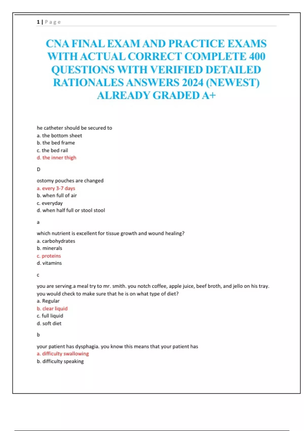CNA FINAL EXAM AND PRACTICE EXAMS WITH ACTUAL CORRECT COMPLETE 400 QUESTIONS WITH VERIFIED DETAILED RATIONALES ANSWERS 2024 (NEWEST) ALREADY GRADED A+