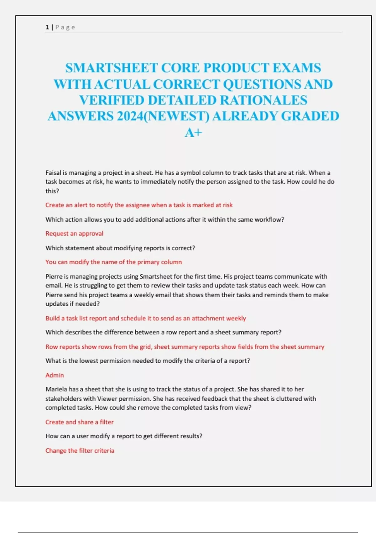 SMARTSHEET CORE PRODUCT EXAMS WITH ACTUAL CORRECT QUESTIONS AND VERIFIED DETAILED RATIONALES ANSWERS 2024(NEWEST) ALREADY GRADED A+