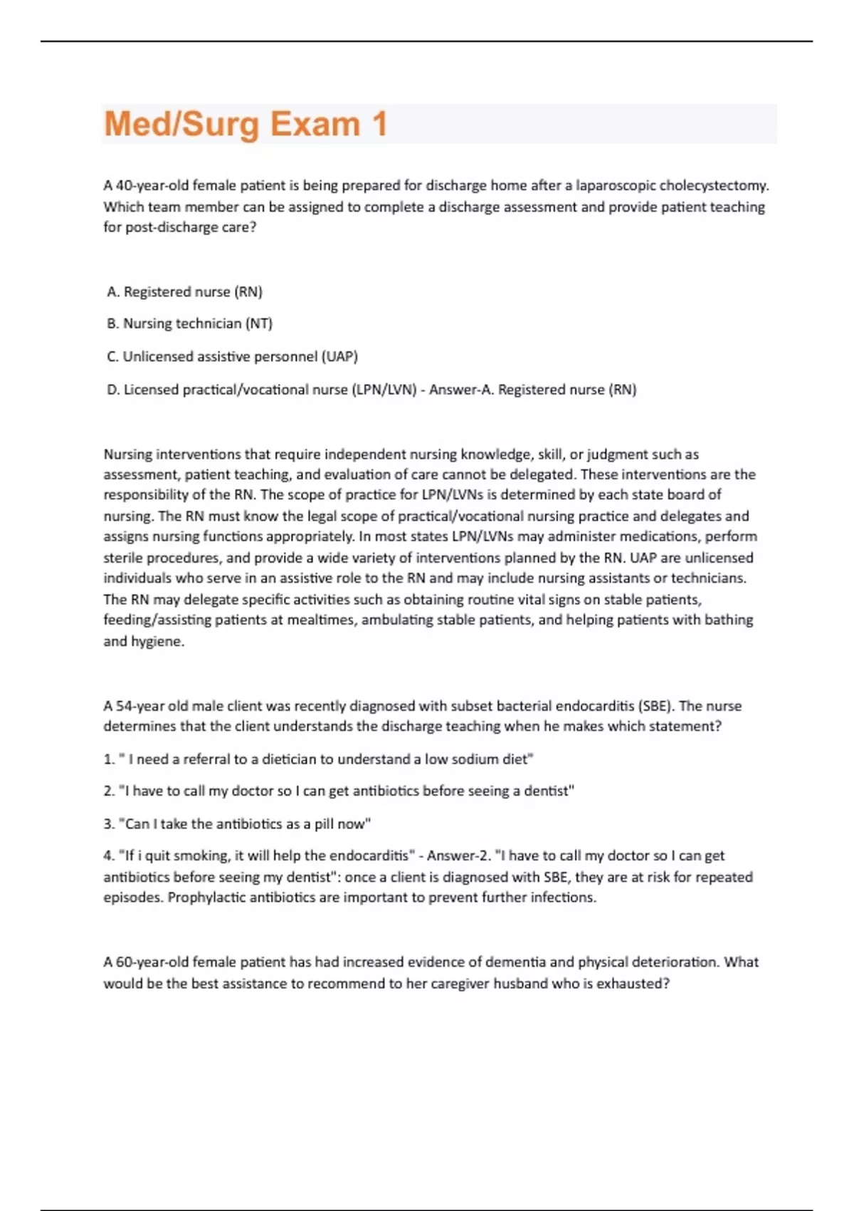 A 40-year-old female patient is being prepared for discharge home after a laparoscopic cholecystectomy. Which team member can be assigned to complete a discharge assessment and provide patient teaching for post-discharge care? A. Registered nurse (RN) B. Nursing technician (NT) C. Unlicensed assistive personnel (UAP) D. Licensed practical/vocational nurse (LPN/LVN) - Answer-A. Registered nurse (RN) Nursing interventions that require independent nursing knowledge, skill, or judgment such as assessment, patient teaching, and evaluation of care cannot be delegated. These interventions are the responsibility of the RN. The scope of practice for LPN/LVNs is determined by each state board of nursing. The RN must know the legal scope of practical/vocational nursing practice and delegates and assigns nursing functions appropriately. In most states LPN/LVNs may administer medications, perform sterile procedures, and provide a wide variety of interventions planned by the RN. UAP are unlicensed individuals who serve in an assistive role to the RN and may include nursing assistants or technicians. The RN may delegate specific activities such as obtaining routine vital signs on stable patients, feeding/assisting patients at mealtimes, ambulating stable patients, and helping patients with bathing and hygiene. A 54-year old male client was recently diagnosed with subset bacterial endocarditis (SBE). The nurse determines that the client understands the discharge teaching when he makes which statement? 1. " I need a referral to a dietician to understand a low sodium diet" 2. "I have to call my doctor so I can get antibiotics before seeing a dentist" 3. "Can I take the antibiotics as a pill now" 4. "If i quit smoking, it will help the endocarditis" - Answer-2. "I have to call my doctor so I can get antibiotics before seeing my dentist": once a client is diagnosed with SBE, they are at risk for repeated episodes. Prophylactic antibiotics are important to prevent further infections. A 60-year-old female patient has had increased evidence of dementia and physical deterioration. What would be the best assistance to recommend to her caregiver husband who is exhausted?a. Long-term care b. Adult day care c. Home health care d.Homemaker services - Answer-b. Adult day care Adult day care provides social, recreational, and health-related services in a safe, community-based environment that would keep this patient safe and decrease the stress on the husband. Long-term care is used when the patient has rapid deterioration, the caregiver is unable to continue to provide care, and there is an alteration in or loss of the family support system. Home health care is used when there is supportive caregiver involvement for patients with health needs. Homemaker services provide services, but do not care for the patient. A 60-year-old female patient has had increased evidence of dementia and physical deterioration. What would be the best assistance to recommend to her caregiver husband who is exhausted? a. Long term care b. Adult day care c. Home health care d. Homemaker services - Answer-b. Adult day care