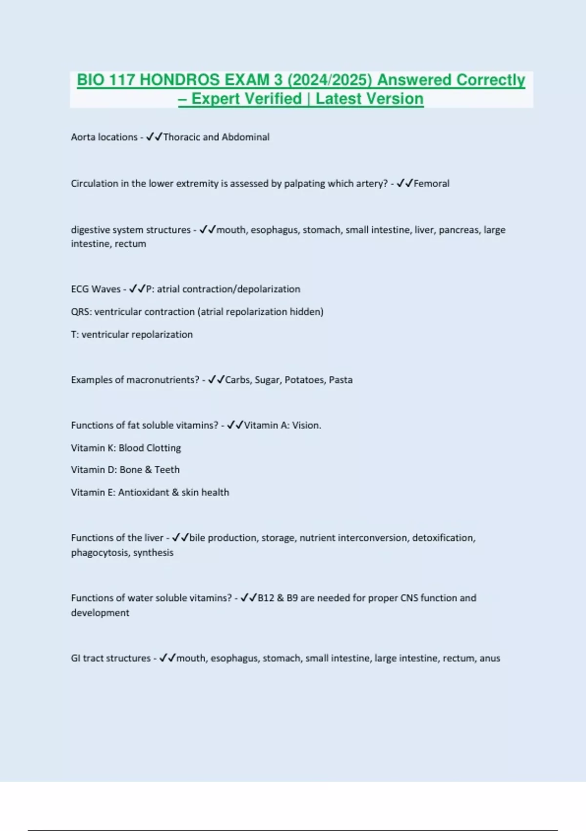 BIO 117 HONDROS EXAM 3 (2024/2025) Answered Correctly – Expert Verified | Latest Version
