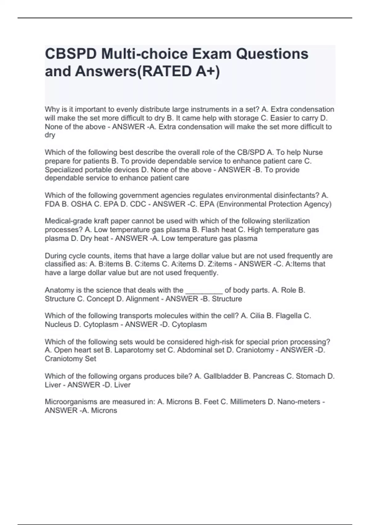 Why is it important to evenly distribute large instruments in a set? A. Extra condensation will make the set more difficult to dry B. It came help with storage C. Easier to carry D. None of the above - ANSWER -A. Extra condensation will make the set more difficult to dry Which of the following best describe the overall role of the CB/SPD A. To help Nurse prepare for patients B. To provide dependable service to enhance patient care C. Specialized portable devices D. None of the above - ANSWER -B. To provide dependable service to enhance patient care Which of the following government agencies regulates environmental disinfectants? A. FDA B. OSHA C. EPA D. CDC - ANSWER -C. EPA (Environmental Protection Agency) Medical-grade kraft paper cannot be used with which of the following sterilization processes? A. Low temperature gas plasma B. Flash heat C. High temperature gas plasma D. Dry heat - ANSWER -A. Low temperature gas plasma During cycle counts, items that have a large dollar value but are not used frequently are classified as: A. B:items B. C:items C. A:items D. Z:items - ANSWER -C. A:Items that have a large dollar value but are not used frequently. Anatomy is the science that deals with the _________ of body parts. A. Role B. Structure C. Concept D. Alignment - ANSWER -B. Structure Which of the following transports molecules within the cell? A. Cilia B. Flagella C. Nucleus D. Cytoplasm - ANSWER -D. Cytoplasm Which of the following sets would be considered high-risk for special prion processing? A. Open heart set B. Laparotomy set C. Abdominal set D. Craniotomy - ANSWER -D. Craniotomy Set Which of the following organs produces bile? A. Gallbladder B. Pancreas C. Stomach D. Liver - ANSWER -D. Liver Microorganisms are measured in: A. Microns B. Feet C. Millimeters D. Nano-meters - ANSWER -A. Microns With respect to rigid sterilization container testing, which term defines the sterilizer's ability to sterilize under actual use conditions? A. Full-load testing B. Maximum-load testing C. Overload testing D. Load testing - ANSWER -B. Maximum-load testing What is the ideal human body temperature? A. 75 F B. 87.4 F C. 98 F D. 98.6 F - ANSWER -D. 98.6 F Which of the following is true of a capsule? A. It is less difficult to kill than vegetive bacteria B. It is more difficult to kill than a spore C. It is resistant to heat and chemicals D. It is easily killed by antibiotics - ANSWER -C. It is resistant to heat and chemicals Pulmonary capillaries are found in which system? A. Muscular System B. Lymphatic System C. Digestive System D. Respiratory System - ANSWER -D. Respiratory System Ethics is the practice of? A. Doing the right thing B. Making money C. Being nice D. None of the above - ANSWER -A. Doing the right thing A microorganism that is resting and has a hard, shell-like outer covering is called a? A. Cell B. Spore C. Capsule D. Prion - ANSWER -B. Spore Transmissible spongiform encephalopathies (TSE) is caused by which of the following? A. Bacteria B. Fungi C. Protozoa D. Prions - ANSWER -D. Prions