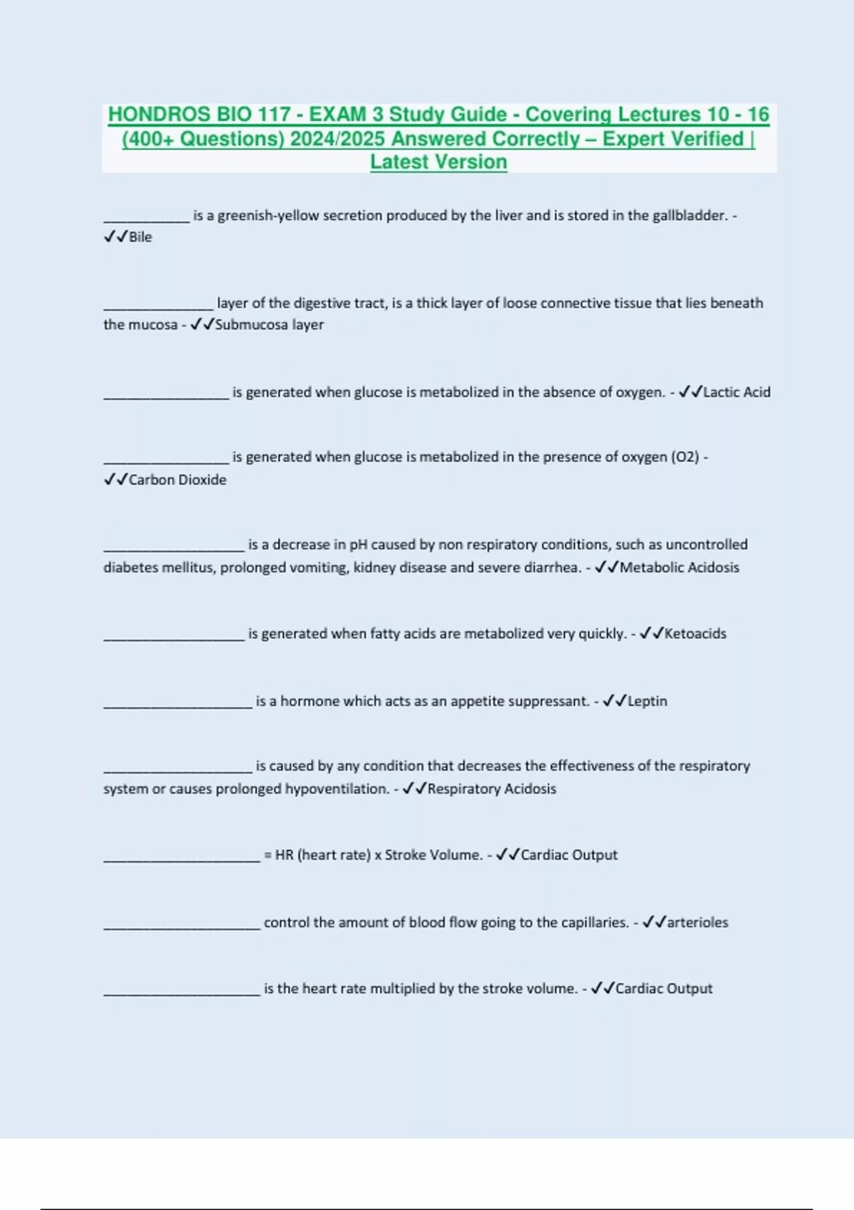 HONDROS BIO 117 - EXAM 3 Study Guide - Covering Lectures 10 - 16 (400+ Questions) 2024/2025 Answered Correctly – Expert Verified | Latest Version