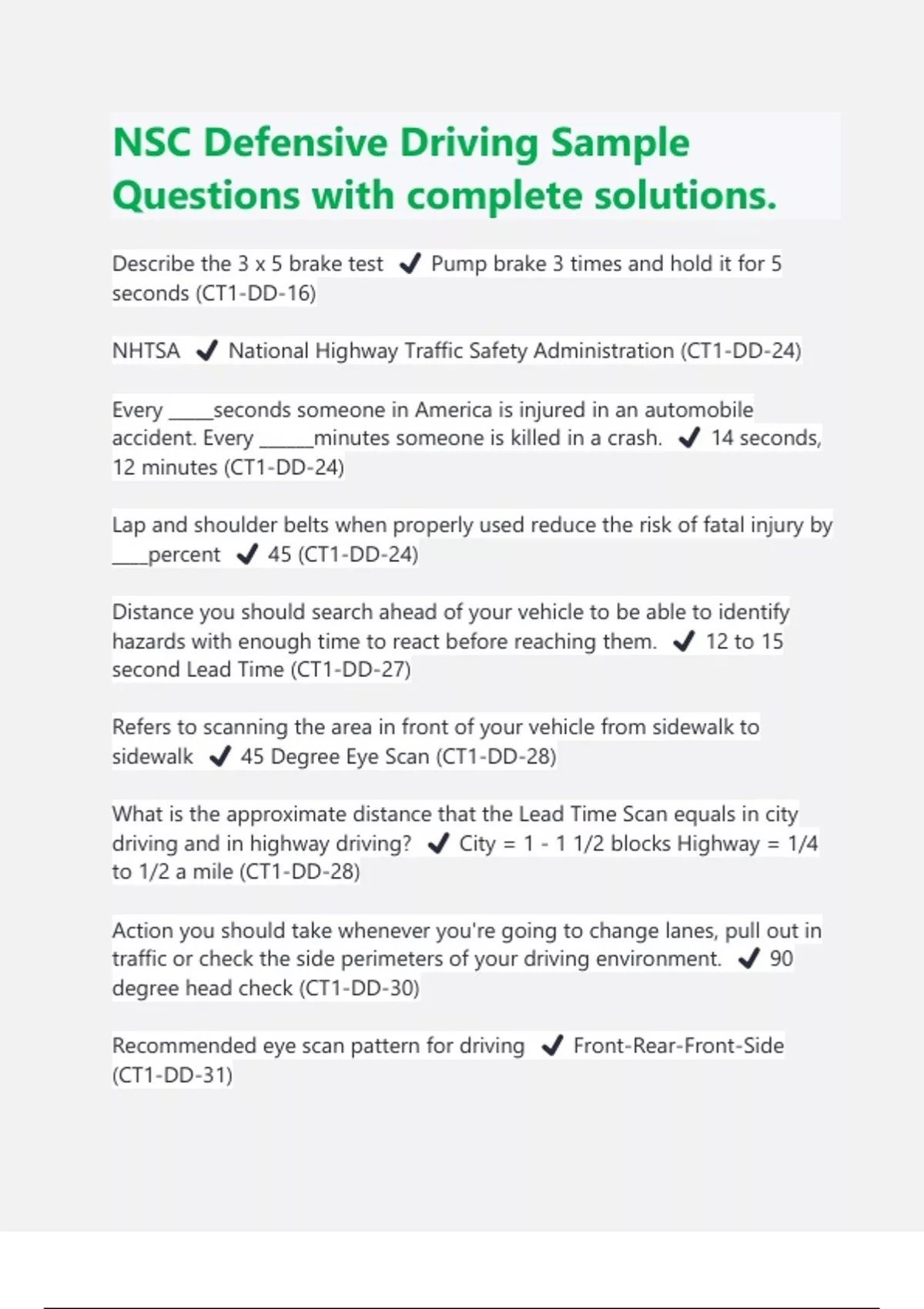 NSC Defensive Driving Sample Questions with complete solutions. Describe the 3 x 5 brake test ️ Pump brake 3 times and hold it for 5 seconds (CT1-DD-16) NHTSA ️ National Highway Traffic Safety Administration (CT1-DD-24) Every _____seconds someone in America is injured in an automobile accident. Every ______minutes someone is killed in a crash. ️ 14 seconds, 12 minutes (CT1-DD-24) Lap and shoulder belts when properly used reduce the risk of fatal injury by ____percent ️ 45 (CT1-DD-24) Distance you should search ahead of your vehicle to be able to identify