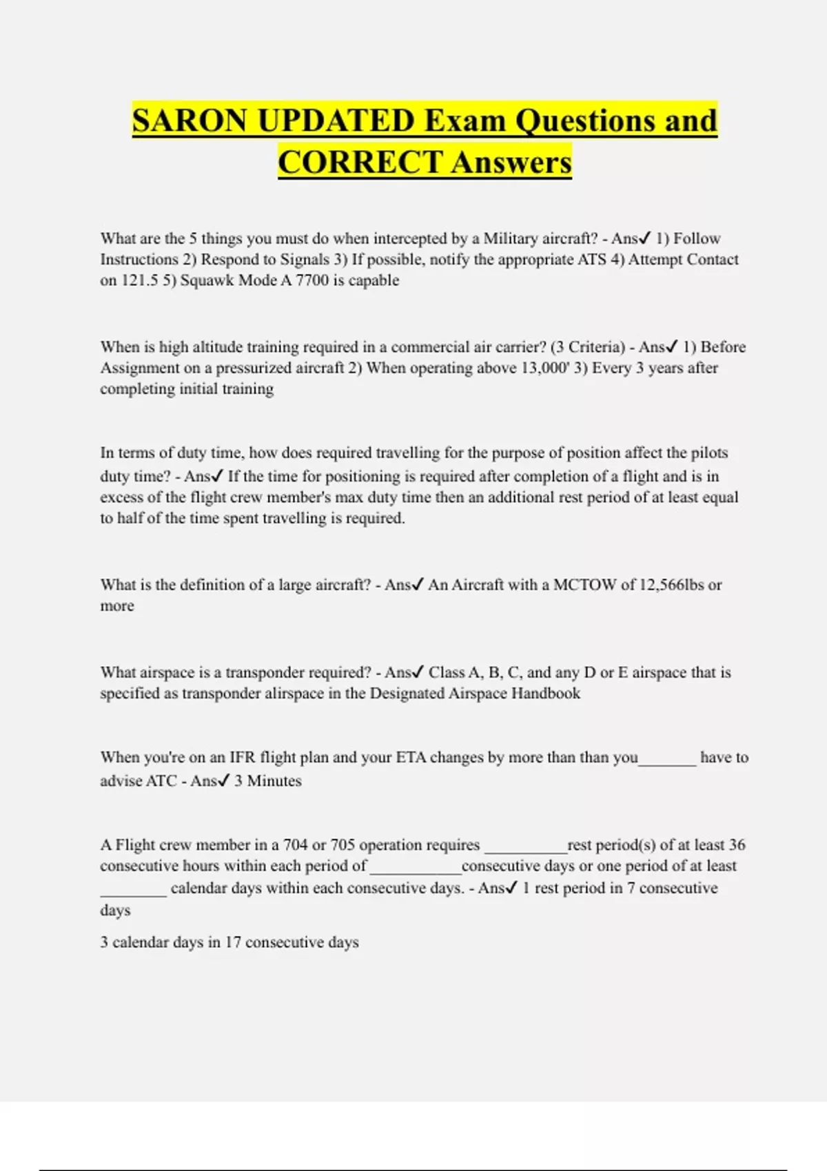 SARON UPDATED Exam Questions and CORRECT Answers What are the 5 things you must do when intercepted by a Military aircraft? - Ans 1) Follow Instructions 2) Respond to Signals 3) If possible, notify the appropriate ATS 4) Attempt Contact on 121.5 5) Squawk Mode A 7700 is capable When is high altitude training required in a commercial air carrier? (3 Criteria) - Ans 1) Before Assignment on a pressurized aircraft 2) When operating above 13,000' 3) Every 3 years after completing initial training