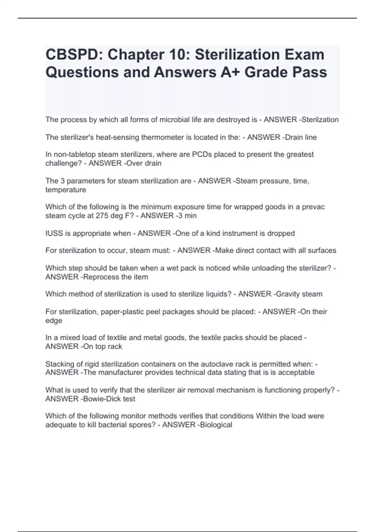 CBSPD: Chapter 10: Sterilization Exam Questions and Answers A+ Grade Pass