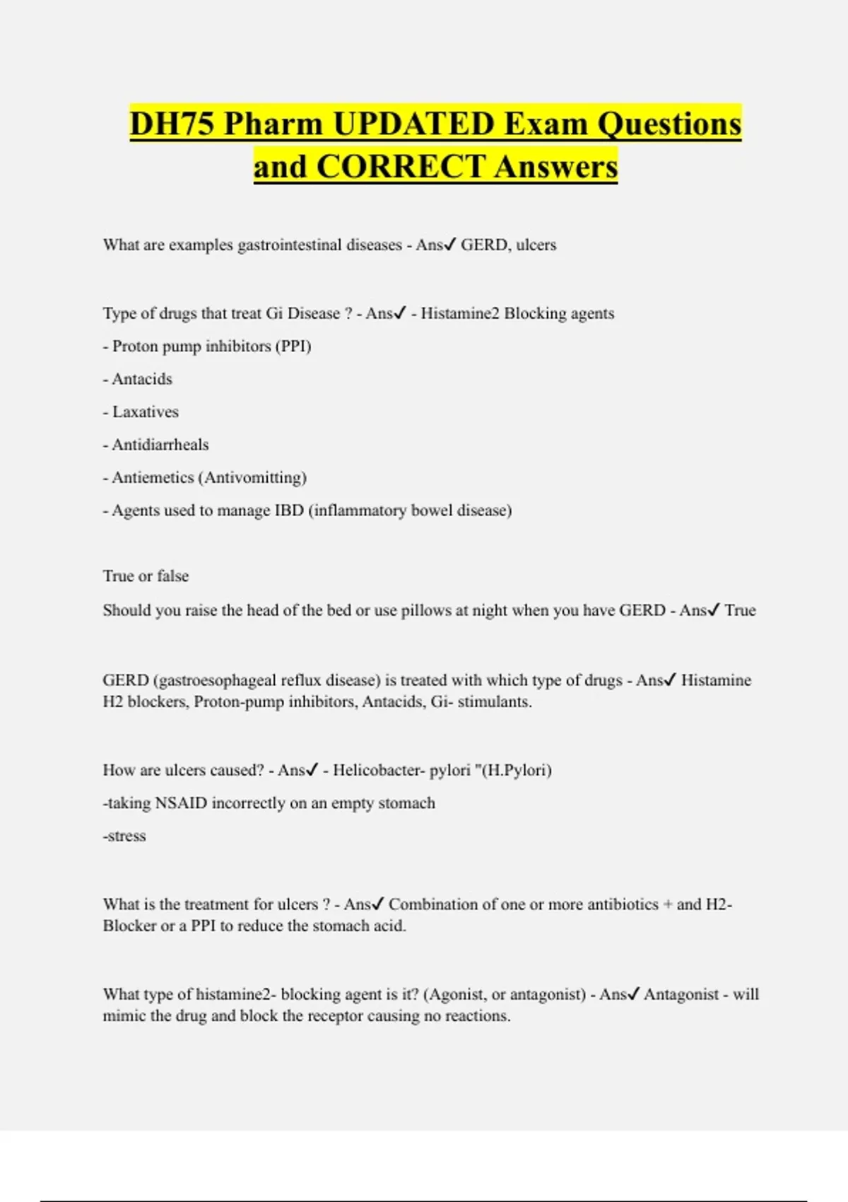 DH75 Pharm UPDATED Exam Questions and CORRECT Answers What are examples gastrointestinal diseases - Ans GERD, ulcers Type of drugs that treat Gi Disease ? - Ans - Histamine2 Blocking agents - Proton pump inhibitors (PPI) - Antacids - Laxatives - Antidiarrheals - Antiemetics (Antivomitting) - Agents used to manage IBD (inflammatory bowel disease