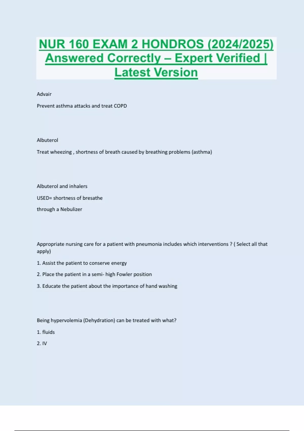 Advair Prevent asthma attacks and treat COPD Albuterol Treat wheezing , shortness of breath caused by breathing problems (asthma) Albuterol and inhalers USED= shortness of bresathe through a Nebulizer Appropriate nursing care for a patient with pneumonia includes which interventions ? ( Select all that apply) 1. Assist the patient to conserve energy 2. Place the patient in a semi- high Fowler position 3. Educate the patient about the importance of hand washing Being hypervolemia (Dehydration) can be treated with what? 1. fluids 2. IV