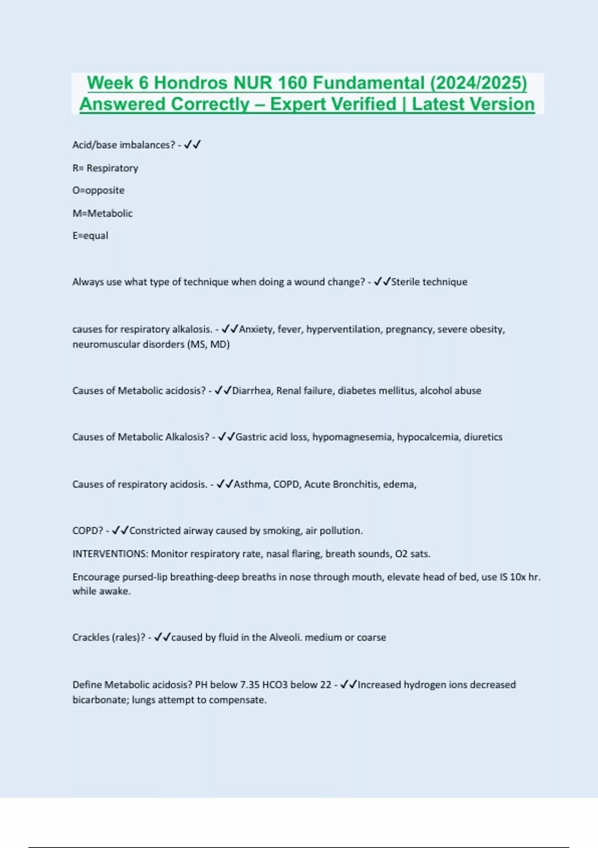 Acid/base imbalances? - R= Respiratory O=opposite M=Metabolic E=equal Always use what type of technique when doing a wound change? - Sterile technique causes for respiratory alkalosis. - Anxiety, fever, hyperventilation, pregnancy, severe obesity, neuromuscular disorders (MS, MD) Causes of Metabolic acidosis? - Diarrhea, Renal failure, diabetes mellitus, alcohol abuse Causes of Metabolic Alkalosis? - Gastric acid loss, hypomagnesemia, hypocalcemia, diuretics Causes of respiratory acidosis. - Asthma, COPD, Acute Bronchitis, edema, COPD? - Constricted airway caused by smoking, air pollution. INTERVENTIONS: Monitor respiratory rate, nasal flaring, breath sounds, O2 sats. Encourage pursed-lip breathing-deep breaths in nose through mouth, elevate head of bed, use IS 10x hr. while awake. Crackles (rales)? - caused by fluid in the Alveoli. medium or coarse Define Metabolic acidosis? PH below 7.35 HCO3 below 22