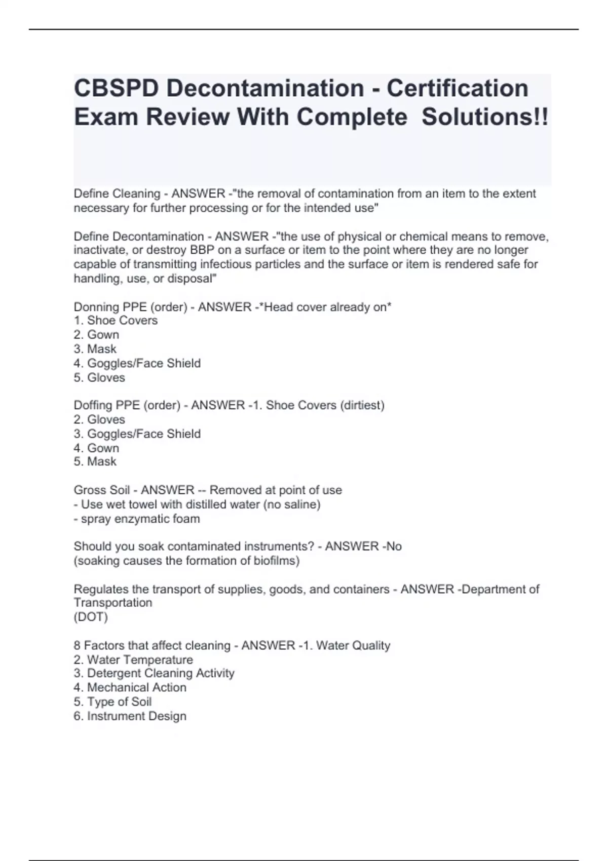 Define Cleaning - ANSWER -"the removal of contamination from an item to the extent necessary for further processing or for the intended use" Define Decontamination - ANSWER -"the use of physical or chemical means to remove, inactivate, or destroy BBP on a surface or item to the point where they are no longer capable of transmitting infectious particles and the surface or item is rendered safe for handling, use, or disposal" Donning PPE (order) - ANSWER -*Head cover already on* 1. Shoe Covers 2. Gown 3. Mask 4. Goggles/Face Shield 5. Gloves Doffing PPE (order) - ANSWER -1. Shoe Covers (dirtiest) 2. Gloves 3. Goggles/Face Shield 4. Gown 5. Mask Gross Soil - ANSWER -- Removed at point of use - Use wet towel with distilled water (no saline) - spray enzymatic foam Should you soak contaminated instruments? - ANSWER -No (soaking causes the formation of biofilms) Regulates the transport of supplies, goods, and containers - ANSWER -Department of Transportation (DOT) 8 Factors that affect cleaning - ANSWER -1. Water Quality 2. Water Temperature 3. Detergent Cleaning Activity 4. Mechanical Action 5. Type of Soil 6. Instrument Design 7. Cleaning and Verification 8. Quality Assurance Who prohibits HCWs from putting hands in bins/containers with soiled instruments? - ANSWER -OSHA Which type of water is used during the first rinse (utility)? - ANSWER -Tap Water (washing, flushing, rinsing) Which type of water is used during the final rinse? - ANSWER -Critical - extensively treated (treated with deionization, reverse osmosis, or distillation) What pH is best for cleaning? - ANSWER -7 - neutral reduces corrosion What impedes rinsing and alters pH of detergent? - ANSWER -Hard Water Substances What causes corrosion, staining, spotting, and increases microbial levels? - ANSWER -Poor Water Quality How often should water quality be tested? - ANSWER -Daily How do you dislodge/remove soils using enzyme-based detergents? - ANSWER -1. Lower surface tension 2. Suspend items in solution for easy washing/rinsing 3. Low sudsing, free rinsing