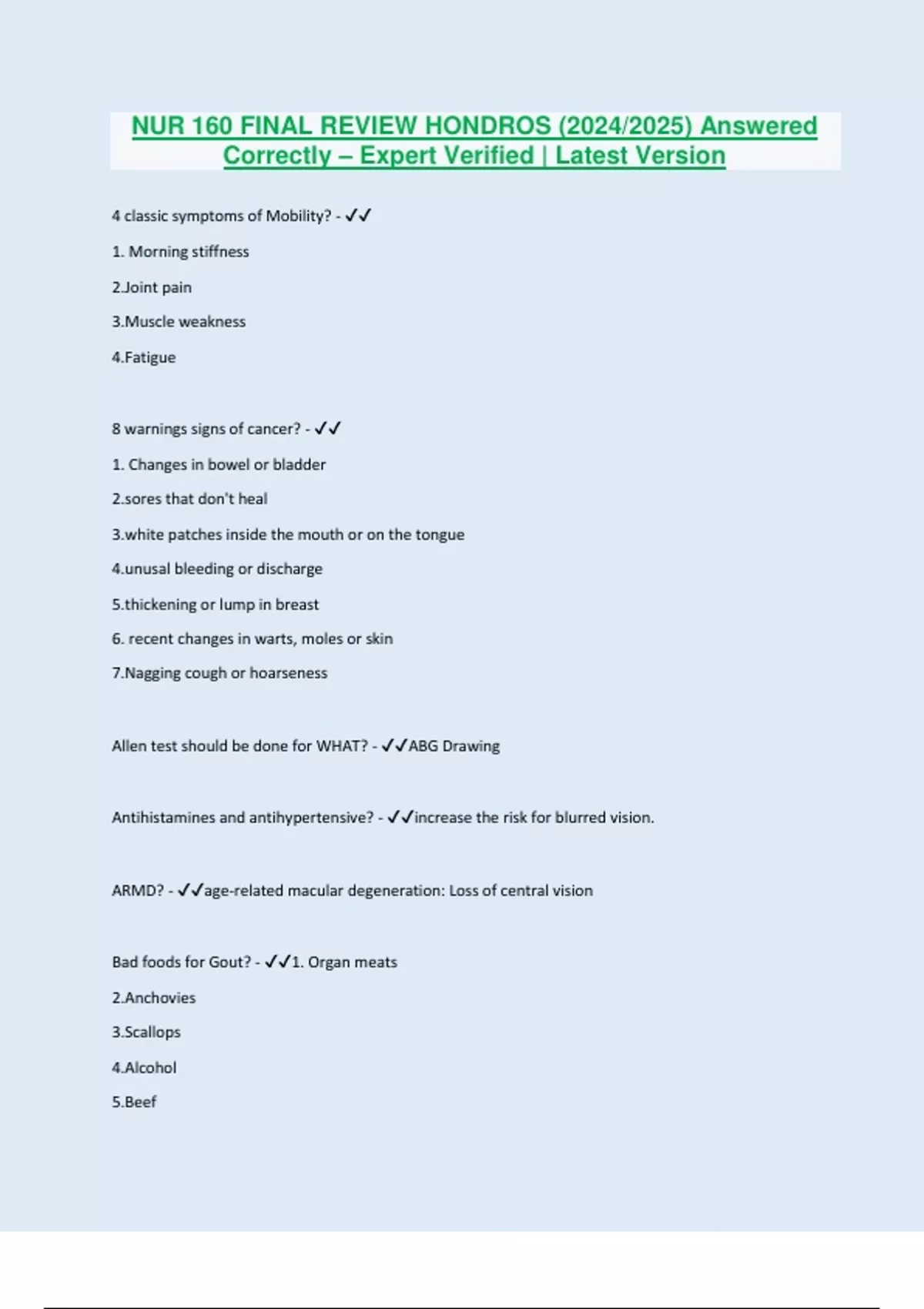 4 classic symptoms of Mobility? - 1. Morning stiffness 2.Joint pain 3.Muscle weakness 4.Fatigue 8 warnings signs of cancer? - 1. Changes in bowel or bladder that don't heal patches inside the mouth or on the tongue l bleeding or discharge ening or lump in breast 6. recent changes in warts, moles or skin 7.Nagging cough or hoarseness Allen test should be done for WHAT? - ABG Drawing Antihistamines and antihypertensive? - increase the risk for blurred vision. ARMD? - age-related macular degeneration: Loss of central vision Bad foods for Gout? - 1. Organ meats 2.Anchovies 3.Scallops 4.Alcohol 5.Beef