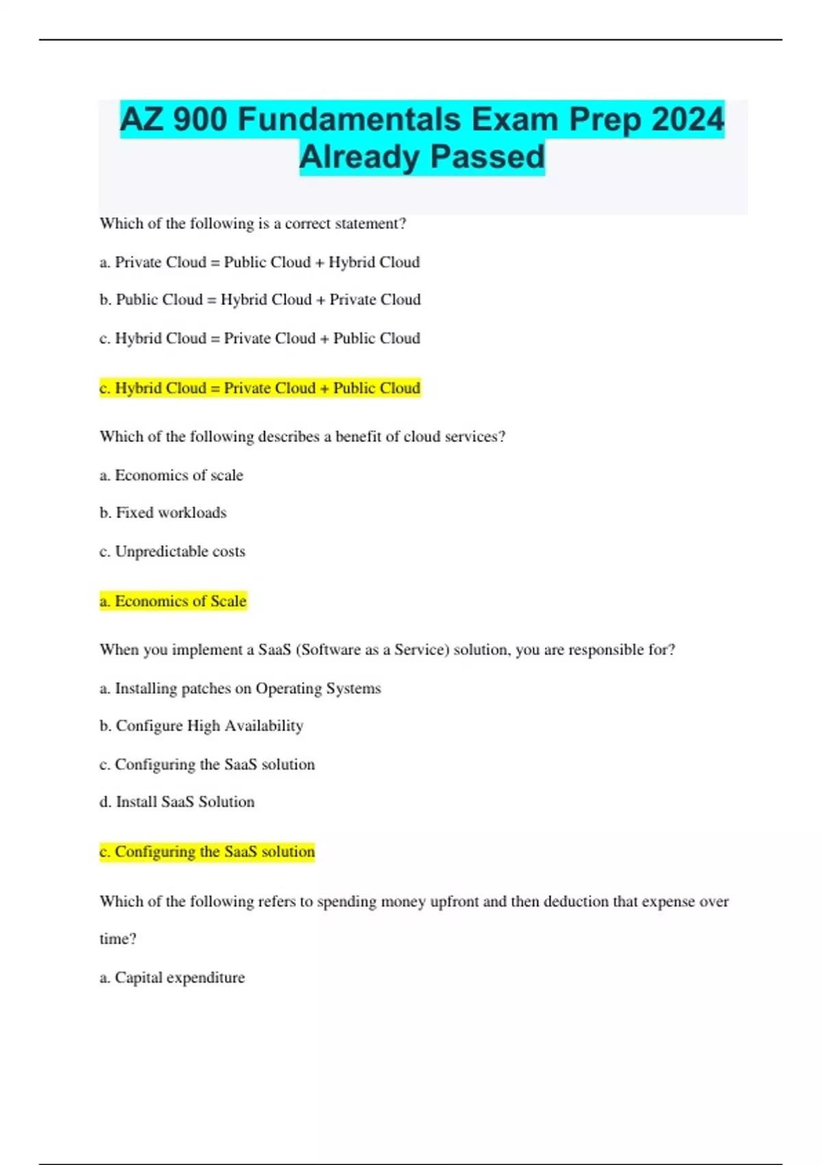 Which of the following is a correct statement? a. Private Cloud = Public Cloud + Hybrid Cloud b. Public Cloud = Hybrid Cloud + Private Cloud c. Hybrid Cloud = Private Cloud + Public Cloud c. Hybrid Cloud = Private Cloud + Public Cloud Which of the following describes a benefit of cloud services? a. Economics of scale b. Fixed workloads c. Unpredictable costs a. Economics of Scale When you implement a SaaS (Software as a Service) solution, you are responsible for? a. Installing patches on Operating Systems b. Configure High Availability c. Configuring the SaaS solution d. Install SaaS Solution c. Configuring the SaaS solution Which of the following refers to spendi