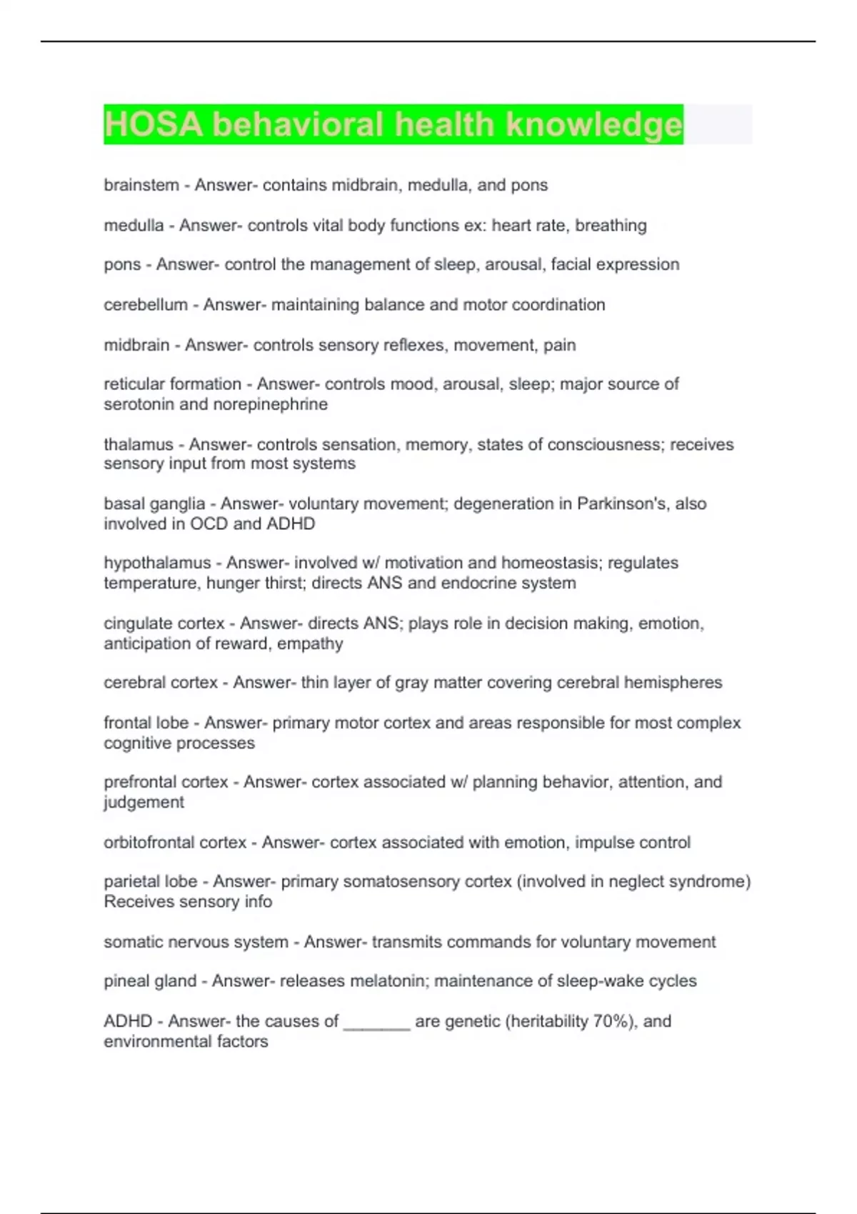HOSA behavioral health knowledge brainstem - Answer- contains midbrain, medulla, and pons medulla - Answer- controls vital body functions ex: heart rate, breathing pons - Answer- control the management of sleep, arousal, facial expression cerebellum - Answer- maintaining balance and motor coordination midbrain - Answer- controls sensory reflexes, movement, pain reticular formation - Answer- controls mood, arousal, sleep; major source of serotonin and norepinephrine thalamus - Answer- controls sensation, memory, states of consciousness; receives sensory input from most systems basal ganglia - Answer- voluntary movement; degeneration in Parkinson's, also involved in OCD and ADHD hypothalamus - Answer- involved w/ motivation and homeostasis; regulates temperature, hunger thirst; directs ANS and endocrine system cingulate cortex - Answer- directs ANS; plays role in decision making, emotion, anticipation of reward, empathy cerebral cortex - Answer- thin layer of gray matter covering cerebral hemispheres frontal lobe - Answer- primary motor cortex and areas responsible for most complex cognitive processes prefrontal cortex - Answer- cortex associated w/ planning behavior, attention, and judgement orbitofrontal cortex - Answer- cortex associated with emotion, impulse control parietal lobe - Answer- primary somatosensory cortex (involved in neglect syndrome) Receives sensory info somatic nervous system - Answer- transmits commands for voluntary movement pineal gland - Answer- releases melatonin; maintenance of sleep-wake cycles ADHD - Answer- the causes of _______ are genetic (heritability 70%), and environmental factors
