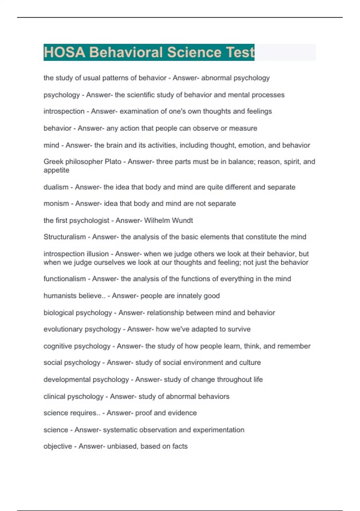 HOSA Behavioral Science Test the study of usual patterns of behavior - Answer- abnormal psychology psychology - Answer- the scientific study of behavior and mental processes introspection - Answer- examination of one's own thoughts and feelings behavior - Answer- any action that people can observe or measure mind - Answer- the brain and its activities, including thought, emotion, and behavior Greek philosopher Plato - Answer- three parts must be in balance; reason, spirit, and appetite dualism - Answer- the idea that body and mind are quite different and separate monism - Answer- idea that body and mind are not separate the first psychologist - Answer- Wilhelm Wundt Structuralism - Answer- the analysis of the basic elements that constitute the mind introspection illusion - Answer- when we judge others we look at their behavior, but when we judge ourselves we look at our thoughts and feeling; not just the behavior functionalism - Answer- the analysis of the functions of everything in the mind humanists believe.. - Answer- people are innately good biological psychology - Answer- relationship between mind and behavior evolutionary psychology - Answer- how we've adapted to survive cognitive psychology - Answer- the study of how people learn, think, and remember social psychology - Answer- study of social environment and culture developmental psychology - Answer- study of change throughout life clinical pyschology - Answer- study of abnormal behaviors science requires.. - Answer- proof and evidence