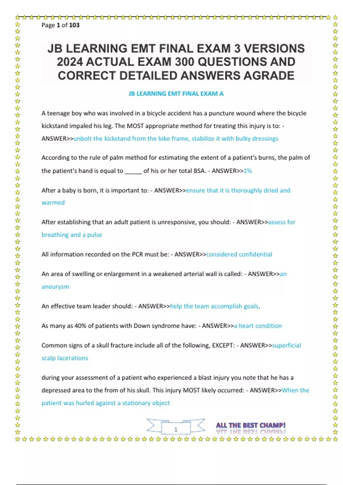 JB LEARNING EMT FINAL EXAM 3 VERSIONS 2024 ACTUAL EXAM 300 QUESTIONS AND CORRECT DETAILED ANSWERS AGRADE.
