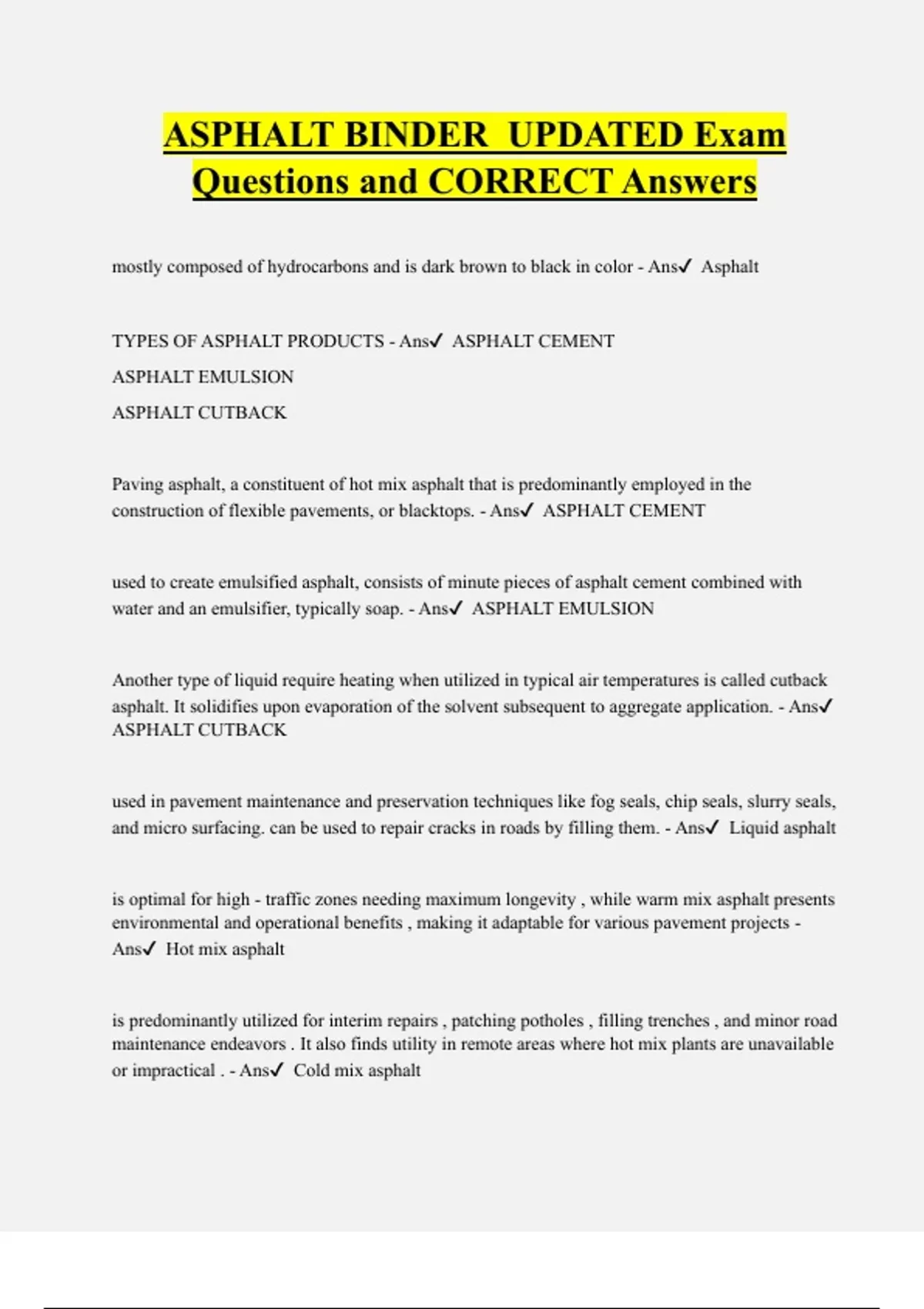 ASPHALT BINDER UPDATED Exam Questions and CORRECT Answers mostly composed of hydrocarbons and is dark brown to black in color - Ans Asphalt TYPES OF ASPHALT PRODUCTS - Ans ASPHALT CEMENT ASPHALT EMULSION ASPHALT CUTBACK Paving asphalt, a constituent of hot mix asphalt that is predominantly employed in the construction of flexible pavements, or blacktops. - Ans ASPHALT CEMENT used to create emulsified asphalt, consists of minute pieces of asphalt cement combined with water and an emulsifier, typically soap. - Ans ASPHALT EMULSION