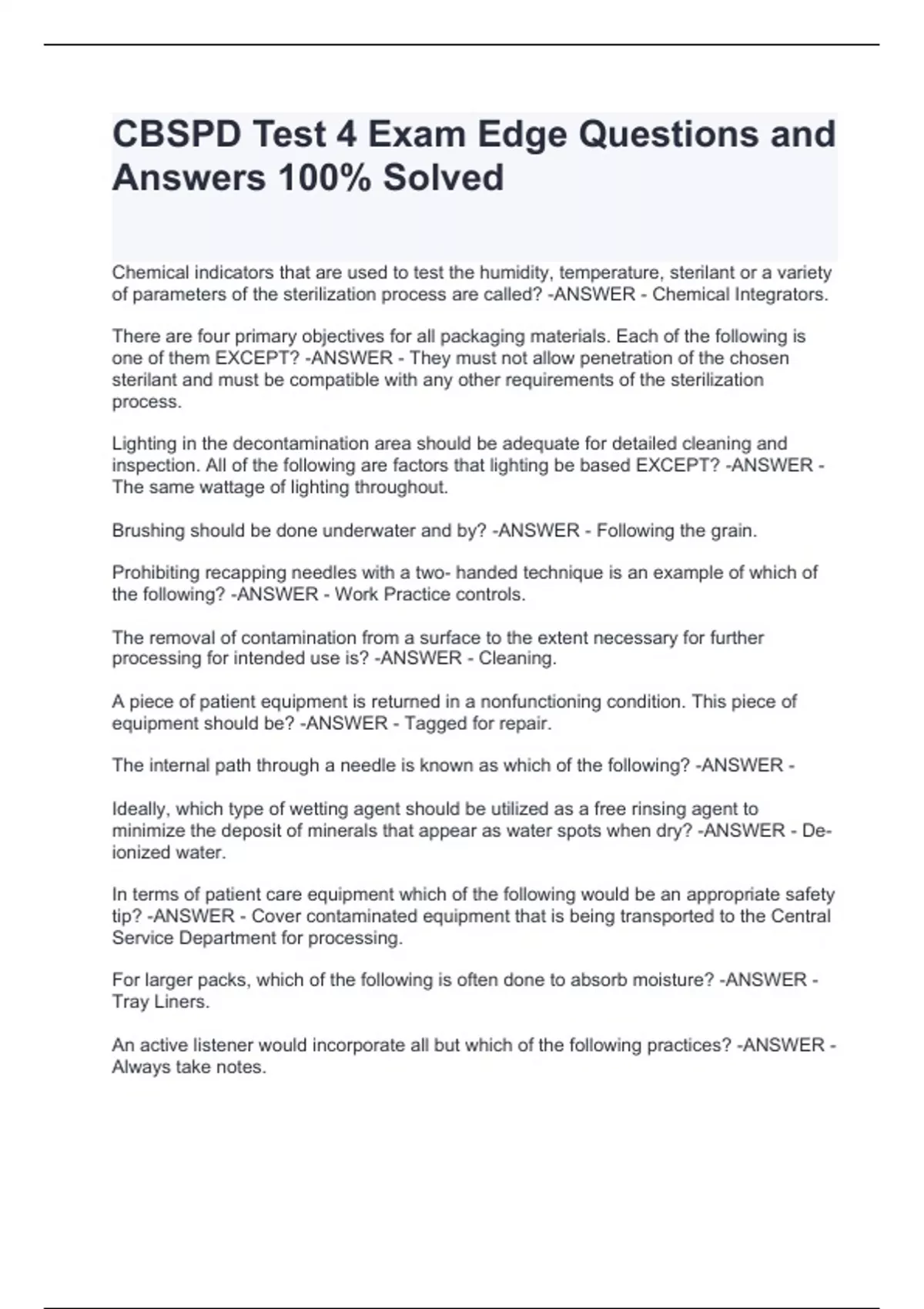 Chemical indicators that are used to test the humidity, temperature, sterilant or a variety of parameters of the sterilization process are called? -ANSWER - Chemical Integrators. There are four primary objectives for all packaging materials. Each of the following is one of them EXCEPT? -ANSWER - They must not allow penetration of the chosen sterilant and must be compatible with any other requirements of the sterilization process. Lighting in the decontamination area should be adequate for detailed cleaning and inspection. All of the following are factors that lighting be based EXCEPT? -ANSWER - The same wattage of lighting throughout. Brushing should be done underwater and by? -ANSWER - Following the grain. Prohibiting recapping needles with a two- handed technique is an example of which of the following? -ANSWER - Work Practice controls. The removal of contamination from a surface to the extent necessary for further processing for intended use is? -ANSWER - Cleaning. A piece of patient equipment is returned in a nonfunctioning condition. This piece of equipment should be? -ANSWER - Tagged for repair. The internal path through a needle is known as which of the following? -ANSWER - Ideally, which type of wetting agent should be utilized as a free rinsing agent to minimize the deposit of minerals that appear as water spots when dry? -ANSWER - De-ionized water. In terms of patient care equipment which of the following would be an appropriate safety tip? -ANSWER - Cover contaminated equipment that is being transported to the Central Service Department for processing. For larger packs, which of the following is often done to absorb moisture? -ANSWER - Tray Liners. An active listener would incorporate all but which of the following practices? -ANSWER - Always take notes.