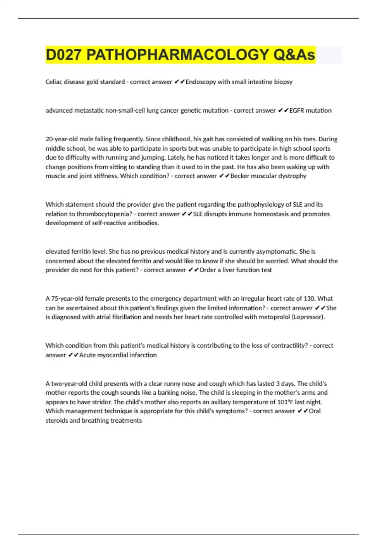 Celiac disease gold standard - correct answer Endoscopy with small intestine biopsy advanced metastatic non-small-cell lung cancer genetic mutation - correct answer EGFR mutation 20-year-old male falling frequently. Since childhood, his gait has consisted of walking on his toes. During middle school, he was able to participate in sports but was unable to participate in high school sports due to difficulty with running and jumping. Lately, he has noticed it takes longer and is more difficult to change positions from sitting to standing than it used to in the past. He has also been waking up with muscle and joint stiffness. Which condition? - correct answer Becker muscular dystrophy Which statement should the provider give the patient regarding the pathophysiology of SLE and its relation to thrombocytopenia? - correct answer SLE disrupts immune homeostasis and promotes development of self-reactive antibodies. elevated ferritin level. She has no previous medical history and is currently asymptomatic. She is concerned about the elevated ferritin and would like to know if she should be worried. What should the provider do next for this patient? - correct answer Order a liver function test A 75-year-old female presents to the emergency department with an irregular heart rate of 130. What can be ascertained about this patient's findings given the limited information? - correct answer She is diagnosed with atrial fibrillation and needs her heart rate controlled with metoprolol (Lopressor). Which condition from this patient's medical history is contributing to the loss of contractility? - correct answer Acute myocardial infarction A two-year-old child presents with a clear runny nose and cough which has lasted 3 days. The child's mother reports the cough sounds like a barking noise. The child is sleeping in the mother's arms and appears to have stridor. The child's mother also reports an axillary temperature of 101°F last night. Which management technique is appropriate for this child's symptoms? - correct answer Oral steroids and breathing treatments ED with blurred vision, fatigue, SOB, disoriented. Labs= glucose >400, sodium 150, potassium 7, serum bicarbonate 12, creatinine 3. Which condition is this patient suffering from? - correct answer Di