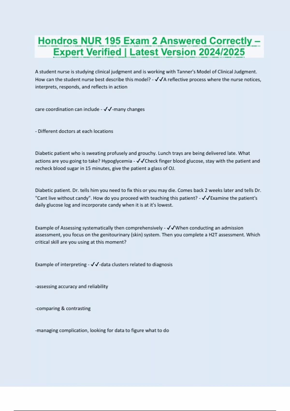 A student nurse is studying clinical judgment and is working with Tanner's Model of Clinical Judgment. How can the student nurse best describe this model? - A reflective process where the nurse notices, interprets, responds, and reflects in action care coordination can include - -many changes - Different doctors at each locations Diabetic patient who is sweating profusely and grouchy. Lunch trays are being delivered late. What actions are you going to take? Hypoglycemia - Check finger blood glucose, stay with the patient and recheck blood sugar in 15 minutes, give the patient a glass of OJ. Diabetic patient. Dr. tells him you need to fix this or you may die. Comes back 2 weeks later and tells Dr. "Cant live without candy". How do you proceed with teaching this patient? - Examine the patient's daily glucose log and incorporate candy when it is at it's lowest. Example of Assessing systematically then comprehensively - When conducting an admission assessment, you focus on the genitourinary (skin) system. Then you complete a H2T assessment. Which critical skill are you using at this moment? Example of interpreting - -data clusters related to diagnosis -assessing accuracy and reliability -comparing & contrasting