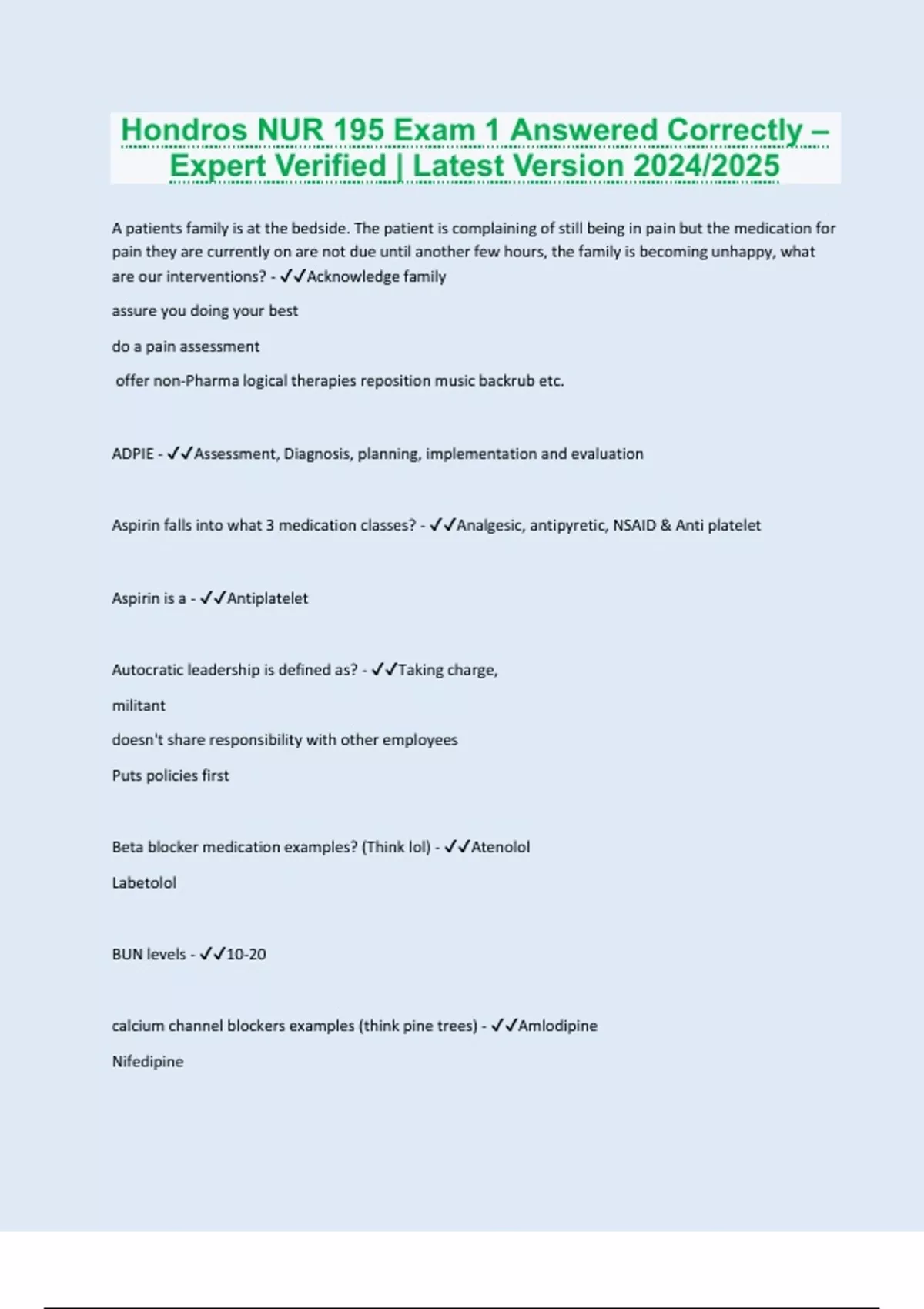 Hondros NUR 195 Exam 1 Answered Correctly – Expert Verified | Latest Version 2024/2025