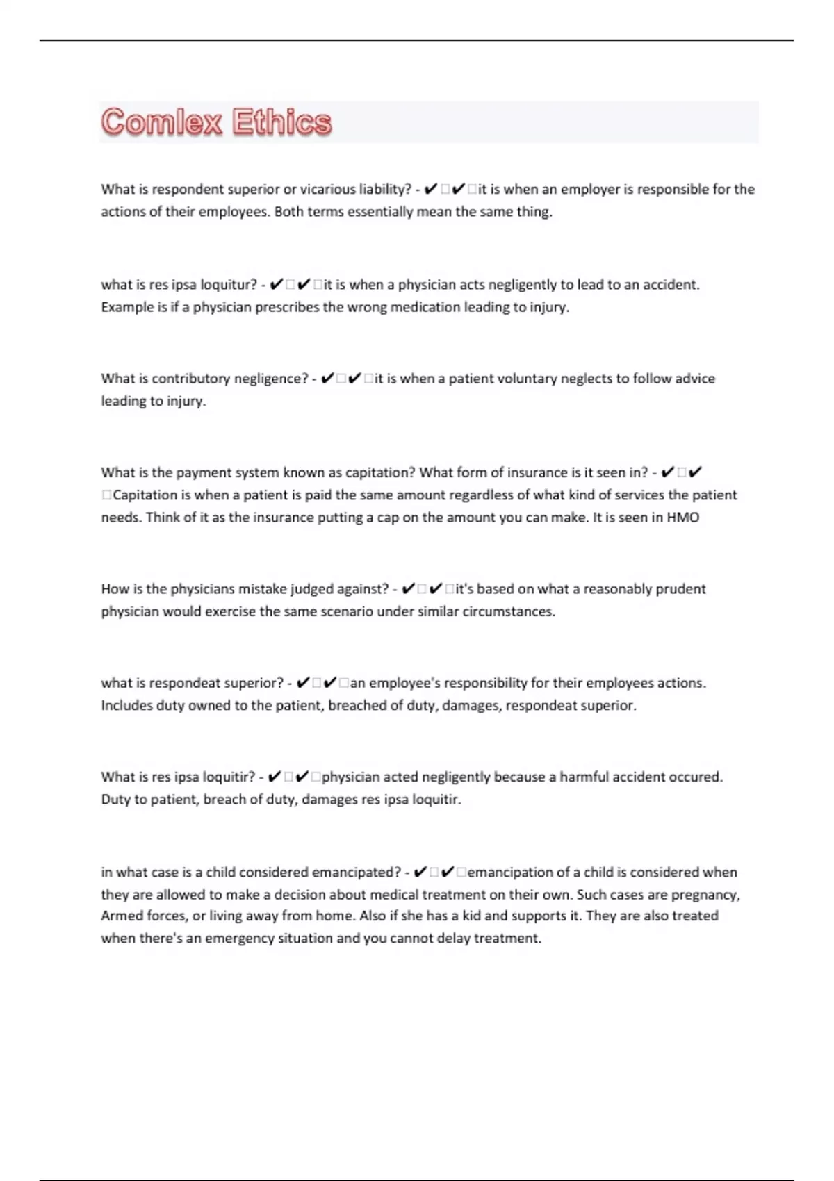 What is respondent superior or vicarious liability? - ️️it is when an employer is responsible for the actions of their employees. Both terms essentially mean the same thing. what is res ipsa loquitur? - ️️it is when a physician acts negligently to lead to an accident. Example is if a physician prescribes the wrong medication leading to injury. What is contributory negligence? - ️️it is when a patient voluntary neglects to follow advice leading to injury. What is the payment system known as capitation? What form of insurance is it seen in? - ️️Capitation is when a patient is paid the same amount regardless of what kind of services the patient needs. Think of it as the insurance putting a cap on the amount you can make. It is seen in HMO How is the physicians mistake judged against? - ️️it's based on what a reasonably prudent physician would exercise the same scenario under similar circumstances. what is respondeat superior? - ️️an employee's responsibility for their employees actions. Includes duty owned to the patient, breached of duty, damages, respondeat superior. What is res ipsa loquitir? - ️️physician acted negligently because a harmful accident occured. Duty to patient, breach of duty, damages res ipsa loquitir. in what case is a child considered emancipated? - ️️emancipation of a child is considered when they are allowed to make a decision about medical treatment on their own. Such cases are pregnancy, Armed forces, or living away from home. Also if she has a kid and supports it. They are also treated when there's an emergency situation and you cannot delay treatment.