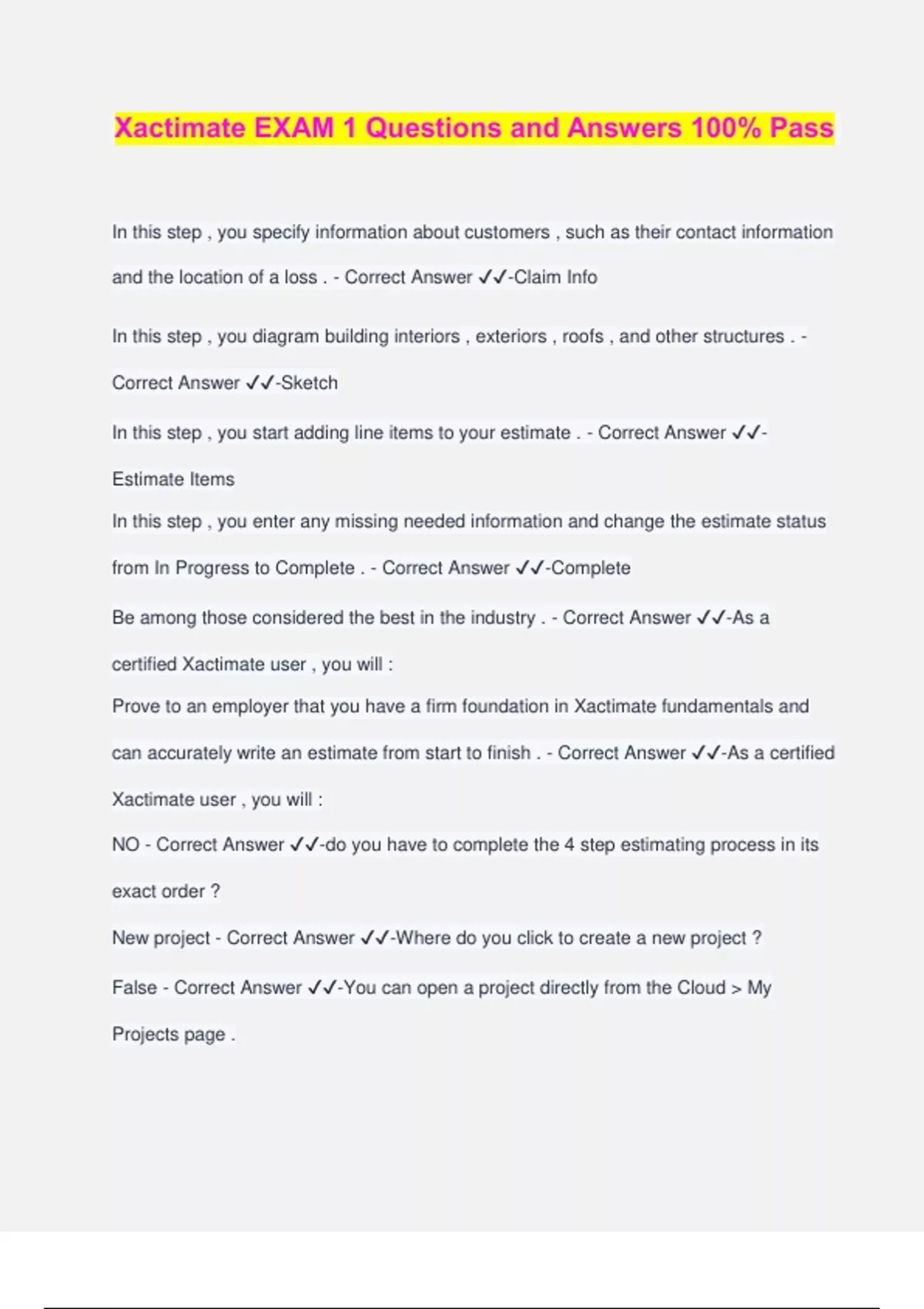 Xactimate EXAM 1 Questions and Answers 100% Pass In this step , you specify information about customers , such as their contact information and the location of a loss . - Correct Answer ️️ -Claim Info In this step , you diagram building interiors , exteriors , roofs , and other structures . - Correct Answer ️️ -Sketch In this step , you start adding line items to your estimate . - Correct Answer ️️ - Estimate Items In this step , you enter any missing needed information and change the estimate status from In Progress to Complete . - Correct Answer ️️ -Complete Be among those considered the best in the industry . - Correct Answer ️️ -As a certified Xactimate user , you will : Prove to an employer that you have a firm foundation in Xactimate fundamentals and can accurately write an estimate from start to finish . - Correct Answer ️️ -As a certified Xactimate user , you will : NO - Correct Answer ️️ -do you have to complete the 4 step estimating process in its exact order ? New project - Correct Answer ️️ -Where do you click to create a new project ? False - Correct Answer ️️ -You can open a project directly from the Cloud > My Projects page . False - Correct Answer ️️ -When entering information in the Insured Info tab , you can only enter one address per estimate . Contractor - Correct Answer ️️ -The Coverage / Loss tab is not available in which profile ? Monthly - Correct Answer ️️ -How often are Xactimate price lists typically updated ? inclusive ; exclusive - Correct Answer ️️ -Xactware surveys prices from contractors in the field . The unit prices the contractors provide — are of costs and fees associated with performing the task , and — of any general overhead and profit percentage . Estimate's date of loss . - Correct Answer ️️ -Insured Info Tab Insured's policy & claim number - Correct Answer ️️ -Coverage / Loss Tab Tax Jurisdiction - Correct Answer ️️ -Parameters Tab False - Correct Answer ️️ -You can import .png , jpg , and .gif files into a company header . True - Correct Answer ️️ -In the Activity ( Default ) dropdown of the Parameters window , selecting Use Price List Defaults keeps the price list default activities . ( 1 ) the Toolbar ( 2 ) the Search pane ( along with the Images and Symbols tabs beneath it ) , ( 3 ) the Sketch Workspace 4 ) the Items List . - Correct Answer ️️ - Sketch Windows Single - break Method - Correct Answer ️️ -Square Break