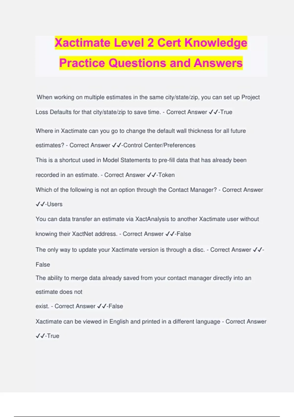 Xactimate Level 2 Cert Knowledge Practice Questions and Answers When working on multiple estimates in the same city/state/zip, you can set up Project Loss Defaults for that city/state/zip to save time. - Correct Answer ️️ -True Where in Xactimate can you go to change the default wall thickness for all future estimates? - Correct Answer ️️ -Control Center/Preferences This is a shortcut used in Model Statements to pre-fill data that has already been recorded in an estimate. - Correct Answer ️️ -Token Which of the following is not an option through the Contact Manager? - Correct Answer ️️ -Users You can data transfer an estimate via XactAnalysis to another Xactimate user without knowing their XactNet address. - Correct Answer ️️ -False The only way to update your Xactimate version is through a disc. - Correct Answer ️️ - False The ability to merge data already saved from your contact manager directly into an estimate does not exist. - Correct Answer ️️ -False Xactimate can be viewed in English and printed in a different language - Correct Answer ️️ -True Which of the following is not an option from the Project tab? - Correct Answer ️️ - Complete a sketch within the project Which of the following is not a wall type option for stairs? - Correct Answer ️️ -Missing below stairs The loss recap automatically updates from an estimate. - Correct Answer ️️ -true When using the Custom staircase tool, after clicking once, the RED measurement indicates what? - Correct Answer ️️ -The total rise of the staircase This tool allows you to change the direction that the sloped or peaked ceiling is running? - Correct Answer ️️ -Orientation When adding a new level, how many feet will sketch add or subtract from the previous level? - Correct Answer ️️ -9 In Sketch, the keyboard shortcut for resetting your visible windows is CT