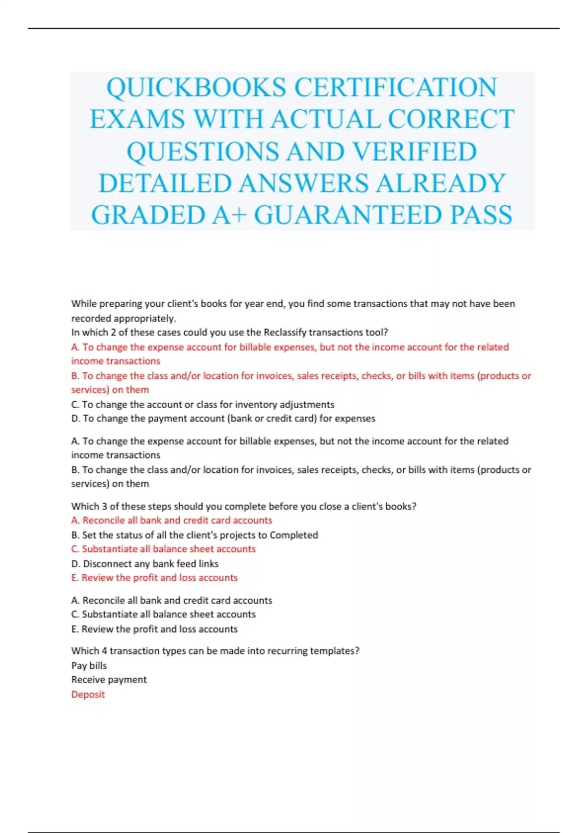 QUICKBOOKS CERTIFICATION EXAMS WITH ACTUAL CORRECT QUESTIONS AND VERIFIED DETAILED ANSWERS ALREADY GRADED A+ GUARANTEED PASS