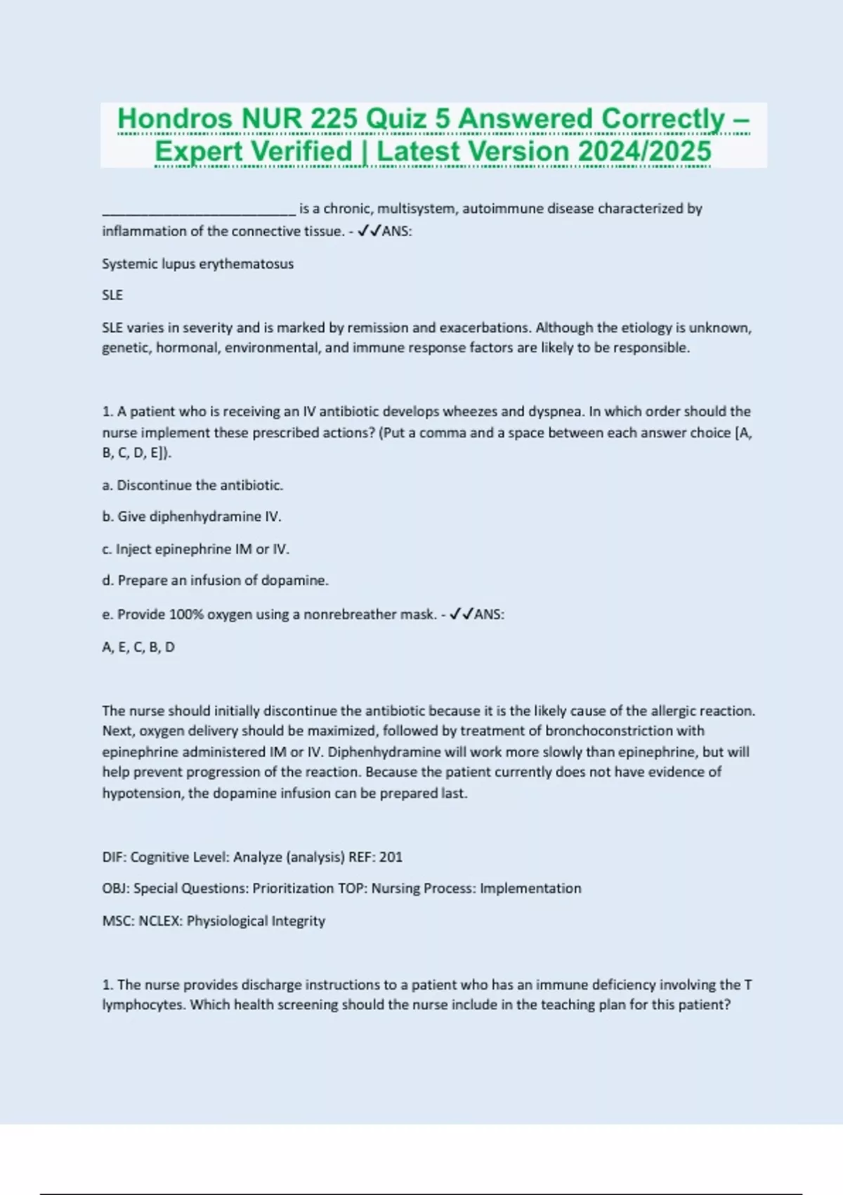 _________________________ is a chronic, multisystem, autoimmune disease characterized by inflammation of the connective tissue. - ANS: Systemic lupus erythematosus SLE SLE varies in severity and is marked by remission and exacerbations. Although the etiology is unknown, genetic, hormonal, environmental, and immune response factors are likely to be responsible. 1. A patient who is receiving an IV antibiotic develops wheezes and dyspnea. In which order should the nurse implement these prescribed actions? (Put a comma and a space between each answer choice [A, B, C, D, E]). a. Discontinue the antibiotic. b. Give diphenhydramine IV. c. Inject epinephrine IM or IV. d. Prepare an infusion of dopamine. e. Provide 100% oxygen using a nonrebreather mask. - ANS: A, E, C, B, D The nurse should initially discontinue the antibiotic because it is the likely cause of the allergic reaction. Next, oxygen delivery should be maximized, followed by treatment of bronchoconstriction with epinephrine administered IM or IV. Diphenhydramine will work more slowly than epinephrine, but will help prevent progression of the reaction. Because the patient currently does not have evidence of hypotension, the dopamine infusion can be prepared last. DIF: Cognitive Level: Analyze (analysis) REF: 201 OBJ: Special Questions: Prioritization TOP: Nursing Process: Implementation MSC: NCLEX: Physiological Integrity 1. The nurse provides discharge instructions to a patient who has an immune deficiency involving the T lymphocytes. Which health screening should the nurse include in the teaching plan for this patient?