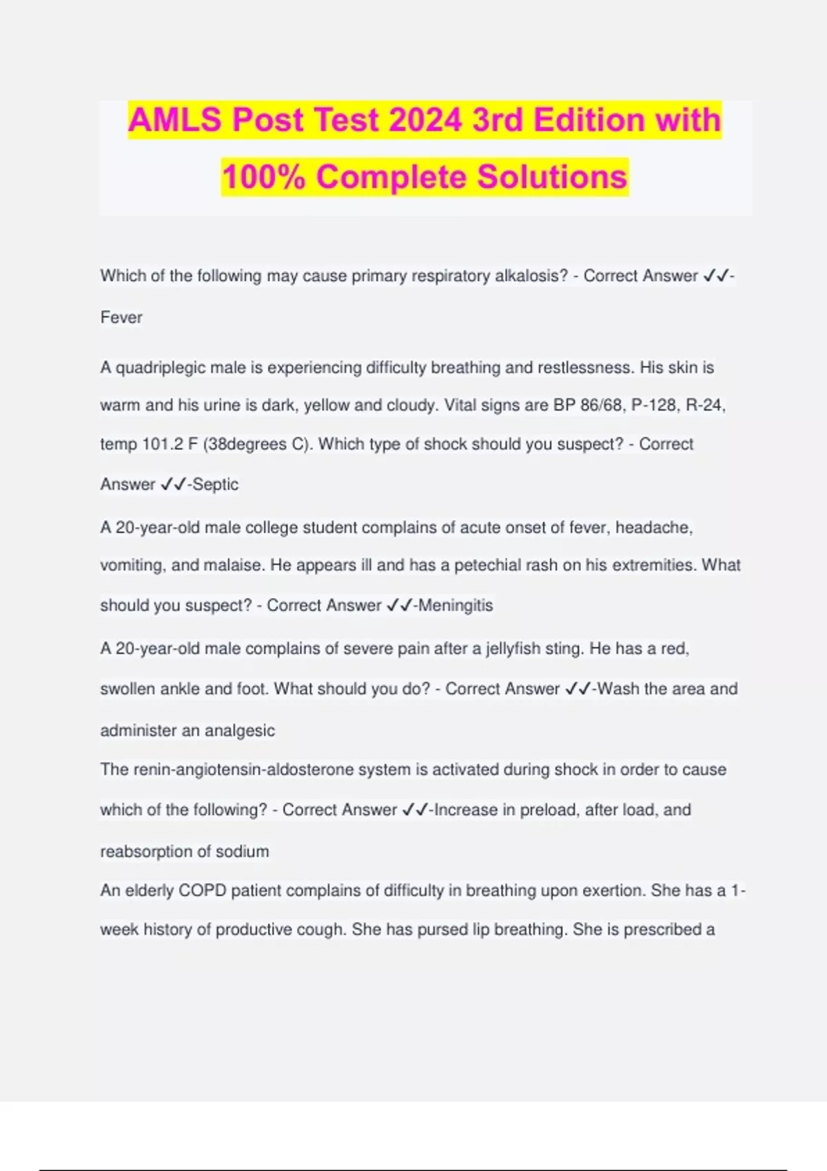AMLS Post Test 2024 3rd Edition with 100% Complete Solutions Which of the following may cause primary respiratory alkalosis? - Correct Answer ️️ - Fever A quadriplegic male is experiencing difficulty breathing and restlessness. His skin is warm and his urine is dark, yellow and cloudy. Vital signs are BP 86/68, P-128, R-24, temp 101.2 F (38degrees C). Which type of shock should you suspect? - Correct Answer ️️ -Septic A 20-year-old male college student complains of acute onset of fever, headache, vomiting, and malaise. He appears ill and has a petechial rash on his extremities. What should you suspect? - Correct Answer ️️ -Meningitis A 20-year-old male complains of severe pain after a jellyfish sting. He has a red, swollen ankle and foot. What should you do? - Correct Answer ️️ -Wash the area and administer an analgesic The renin-angiotensin-aldosterone system is activated during shock in order to cause which of the following? - Correct Answer ️️ -Increase in preload, after load, and reabsorption of sodium An elderly COPD patient complains of difficulty in breathing upon exertion. She has a 1- week history of productive cough. She has pursed lip breathing. She is prescribed a bronchodilator as needed. Vital signs are BP 132/70, P-88, R-20 with Rhonchi. What should you suspect? - Correct Answer ️️ -Epiglottitis An anxious 32-year-old female complains of chest pains with palpitations. She has a history of Grave's disease. She reports she was seen in the ED earlier that day and had a CT scan of her abdomen with IV contrast. She is diaphoretic and has a temperature of 101.5 F (38.6 C). Vital signs are BP-100/62, P-156, R-30, BGL 133mg/dL. What should you administer? - Correct Answer ️️ -Normal Saline What statement is correct regarding responding to a suspected nerve agent exposure? - Correct Answer ️️ -Patients should be treated in a well-ventilated area What reference is the MOST beneficial to obtain for a suspected stroke? - Correct Answer ️️ -Last Known Well Which of the following statements is correct regarding radioactive materials? - Correct Answer ️️ -Simple clothing can stop beta particles from entering the body What finding is unique to pericarditis? - Correct Answer ️️ -Diffuse ST segment elevation A 21-year-old male complains of sharp chest pain and shortness of brea