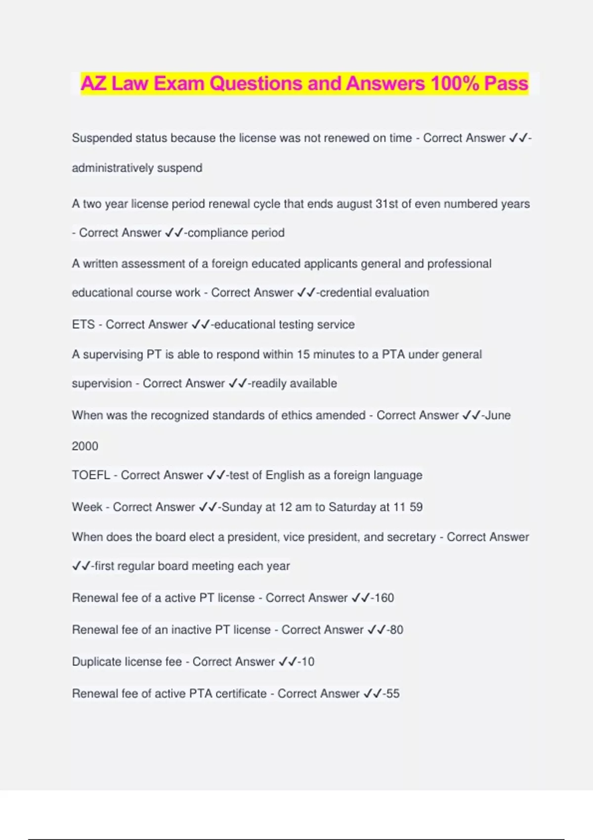 AZ Law Exam Questions and Answers 100% Pass Suspended status because the license was not renewed on time - Correct Answer ️️ - administratively suspend A two year license period renewal cycle that ends august 31st of even numbered years - Correct Answer ️️ -compliance period A written assessment of a foreign educated applicants general and professional educational course work - Correct Answer ️️ -credential evaluation ETS - Correct Answer ️️ -educational testing service A supervising PT is able to respond within 15 minutes to a PTA under general supervision - Correct Answer ️️ -readily available When was the recognized standards of ethics amended - Correct Answer ️️ -June 2000 TOEFL - Correct Answer ️️ -test of English as a foreign language Week - Correct Answer ️️ -Sunday at 12 am to Saturday at 11 59 When does the board elect a president, vice president, and secretary - Correct Answer ️️ -first regular board meeting each year Renewal fee of a active PT license - Correct Answer ️️ -160 Renewal fee of an inactive PT license - Correct Answer ️️ -80 Duplicate license fee - Correct Answer ️️ -10 Renewal fee of active PTA certificate - Correct Answer ️️ -55