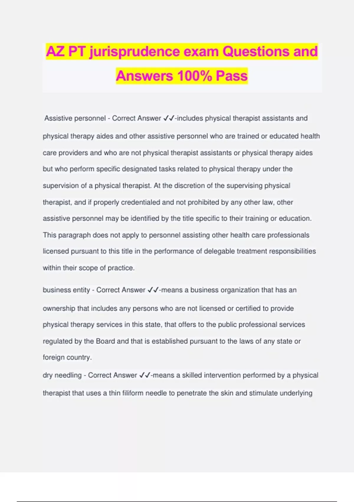 AZ PT jurisprudence exam Questions and Answers 100% Pass Assistive personnel - Correct Answer ️️ -includes physical therapist assistants and physical therapy aides and other assistive personnel who are trained or educated health care providers and who are not physical therapist assistants or physical therapy aides but who perform specific designated tasks related to physical therapy under the supervision of a physical therapist. At the discretion of the supervising physical therapist, and if properly credentialed and not prohibited by any other law, other assistive personnel may be identified by the title specific to their training or education. This paragraph does not apply to personnel assisting other health care professionals licensed pursuant to this title in the performance of delegable treatment responsibilities within their scope of practice. business entity - Correct Answer ️️ -means a business organization that has an ownership that includes any persons who are not licensed or certified to provide physical therapy services in this state, that offers to the public professional services regulated by the Board and that is established pursuant to the laws of any state or foreign country. dry needling - Correct Answer ️️ -means a skilled intervention performed by a physical therapist that uses a thin filiform needle to penetrate the skin and stimulate underlying neural, muscular and connective tissues for the evaluation and management of neuromusculoskeletal conditions, pain and movement impairments. general supervision - Correct Answer ️️ -means that the supervising physical therapist is on call and is readily available via telecommunications when the physical therapist assistant is providing treatment interventions." interim permit - Correct Answer ️️ -means a permit issued by the board that allows a person to practice as a physical therapist in this state or to work as a physical therapist assistant for a specific period of time and under conditions prescribed by the board before that person is issued a license or certificate. manual therapy techniques - Correct Answer ️️ -means a broad group of passive interventions in which physical therapists use their hands to administer skilled movements designed to modulate pain, increase joint range of motion, reduce or eliminate soft tissue swelling, inflammation, or restriction, induce relaxation, improve contractile and noncontractile tissue extensibility, and improve pulmonary function. These interventions involve a variety of techniques, such as the application of graded forces. on-site supervision - Correct Answer ️️ -eans that the supervising physical therapist is on site and is present in the facility or on the campus where assistive personnel or a holder of an interim permit is performing services, is immediately available to assist the person being supervised in the services being performed and maintains continued involvement in appropriate aspects of each treatment session in which a component of treatment is delegated. practice of physical therapy - Correct Answer ️️ -(a) Examining, evaluating and testing persons who have mechanical, physiological and developmental impairments, functional limitations and disabilities or other health and movement related conditions in order to determine a diagnosis, a prognosis and a plan of therapeutic intervention and to assess the ongoing effects of intervention. (b) Alleviating impairments and functional limitations by managing, designing, implementing and modifying therapeutic interventions including: (i) Therapeutic exercise. (ii) Functional training in self-care and in home, community or work reintegration. (iii) Manual therapy techniques. (iv) Therapeutic massage. (v) Assistive and adaptive orthotic, prosthetic, protective and supportive devices and equipment. (vi) Pulmonary hygiene. (vii) Debridement and wound care. (viii) Physical agents or modalities. (ix) Mechanical and electrotherapeutic modalities. (x) Patient related instruction. (c) Reducing the risk of injury, impairments, functional limitations and disability by means that include promoting and maintaining a person's fitness, health and quality of life. (d) Engaging in administration, consultation, education and research. restricted certificate - Correct Answer ️️ -means a certificate on which th