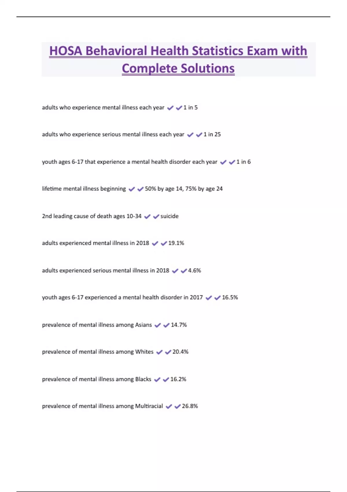 HOSA Behavioral Health Statistics Exam with Complete Solutions adults who experience mental illness each year 1 in 5 adults who experience serious mental illness each year 1 in 25 youth ages 6-17 that experience a mental health disorder each year 1 in 6 lifetime mental illness beginning 50% by age 14, 75% by age 24 2nd leading cause of death ages 10-34 suicide adults experienced mental illness in 2018 19.1% adults experienced serious mental illness in 2018 4.6% youth ages 6-17 experienced a mental health disorder in 2017 16.5%