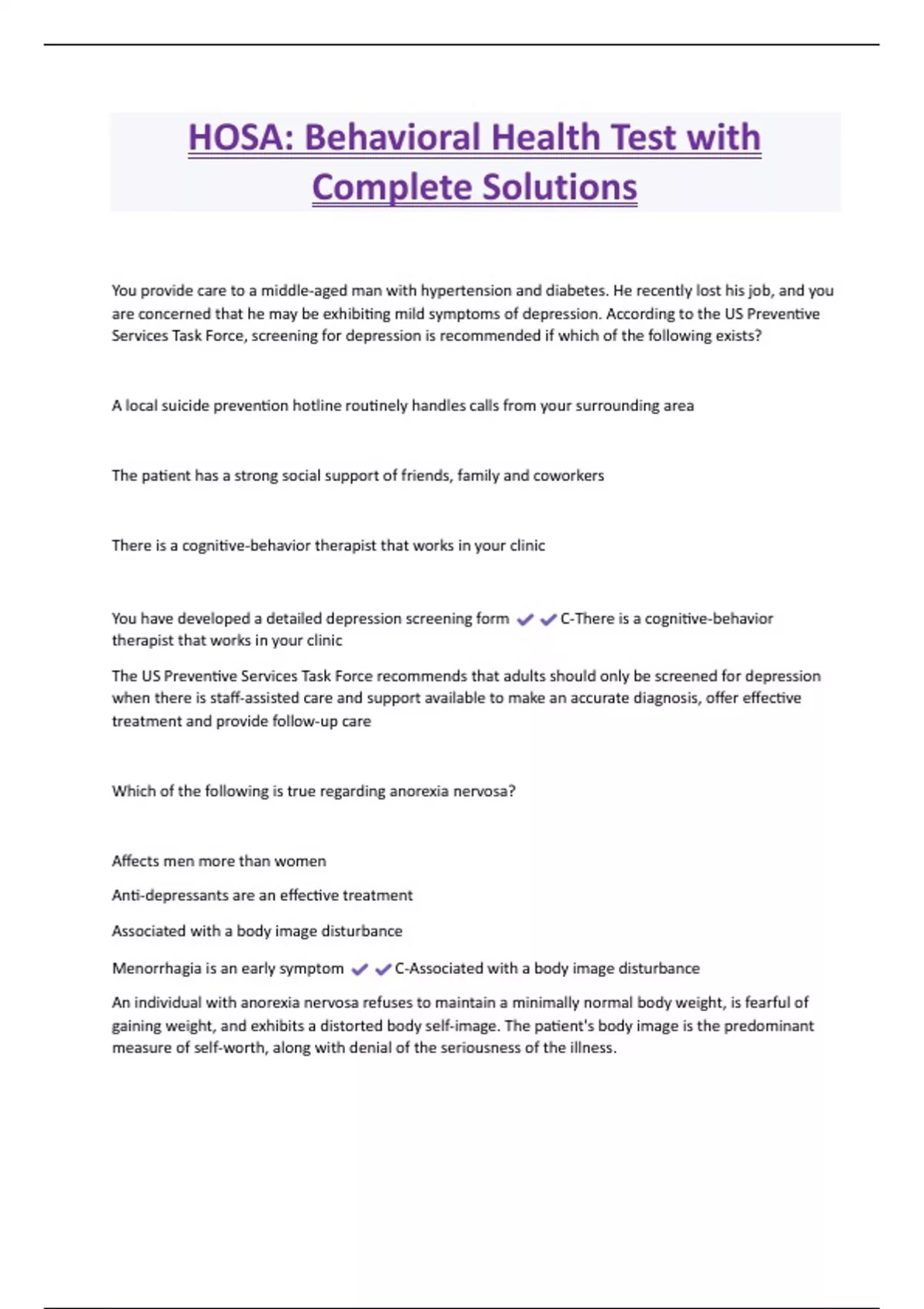 HOSA: Behavioral Health Test with Complete Solutions You provide care to a middle-aged man with hypertension and diabetes. He recently lost his job, and you are concerned that he may be exhibiting mild symptoms of depression. According to the US Preventive Services Task Force, screening for depression is recommended if which of the following exists? A local suicide prevention hotline routinely handles calls from your surrounding area The patient has a strong social support of friends, family and coworkers There is a cognitive-behavior therapist that works in your clinic You have developed a detailed depression screening form C-There is a cognitive-behavior therapist that works in your clinic The US Preventive Services Task Force recommends that adults should only be screened for depression when there is staff-assisted care and support available to make an accurate diagnosis, offer effective treatment and provide follow-up care Which of the following is true regarding anorexia nervosa?