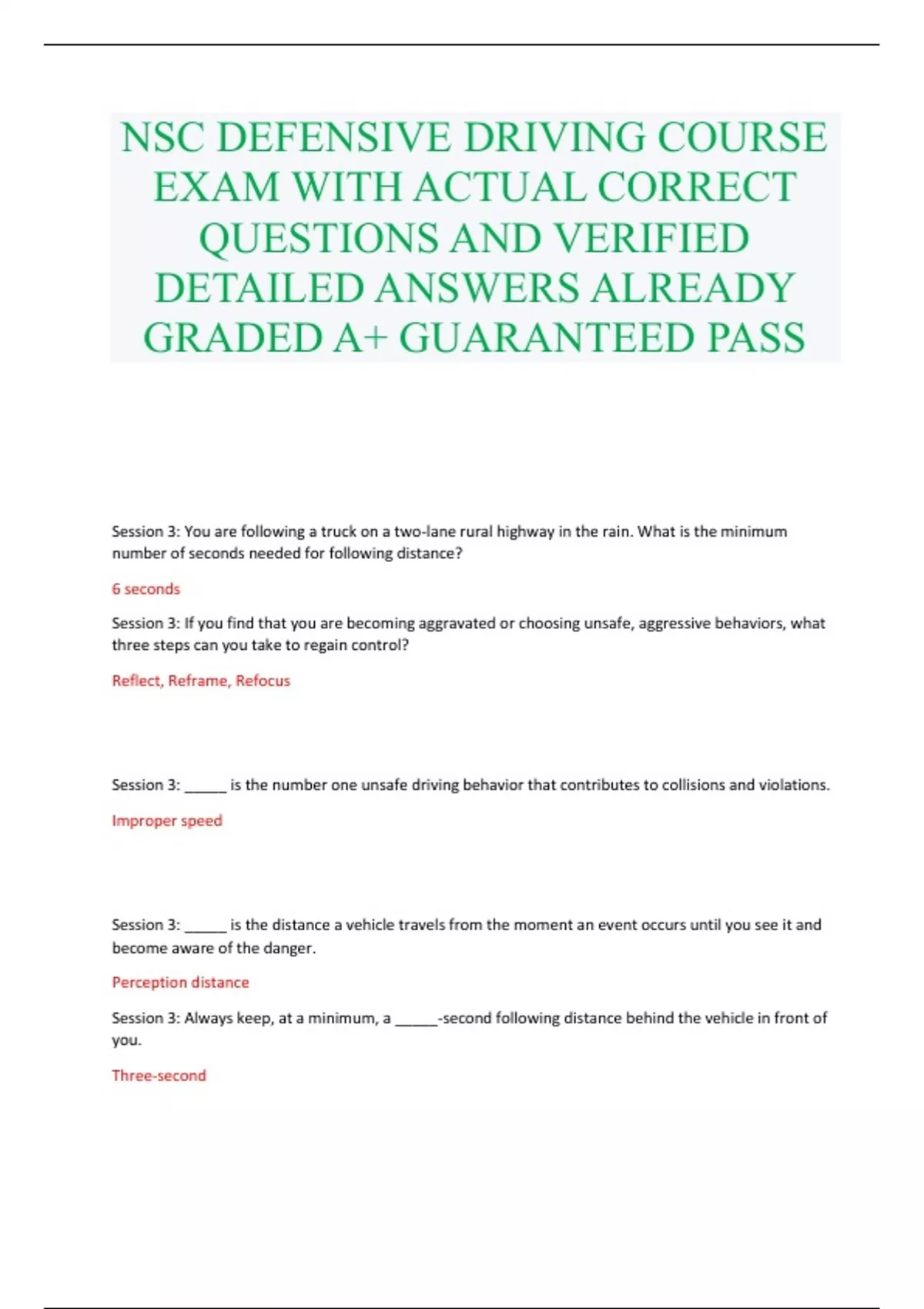 NSC DEFENSIVE DRIVING COURSE EXAM WITH ACTUAL CORRECT QUESTIONS AND VERIFIED DETAILED ANSWERS ALREADY GRADED A+ GUARANTEED PASS