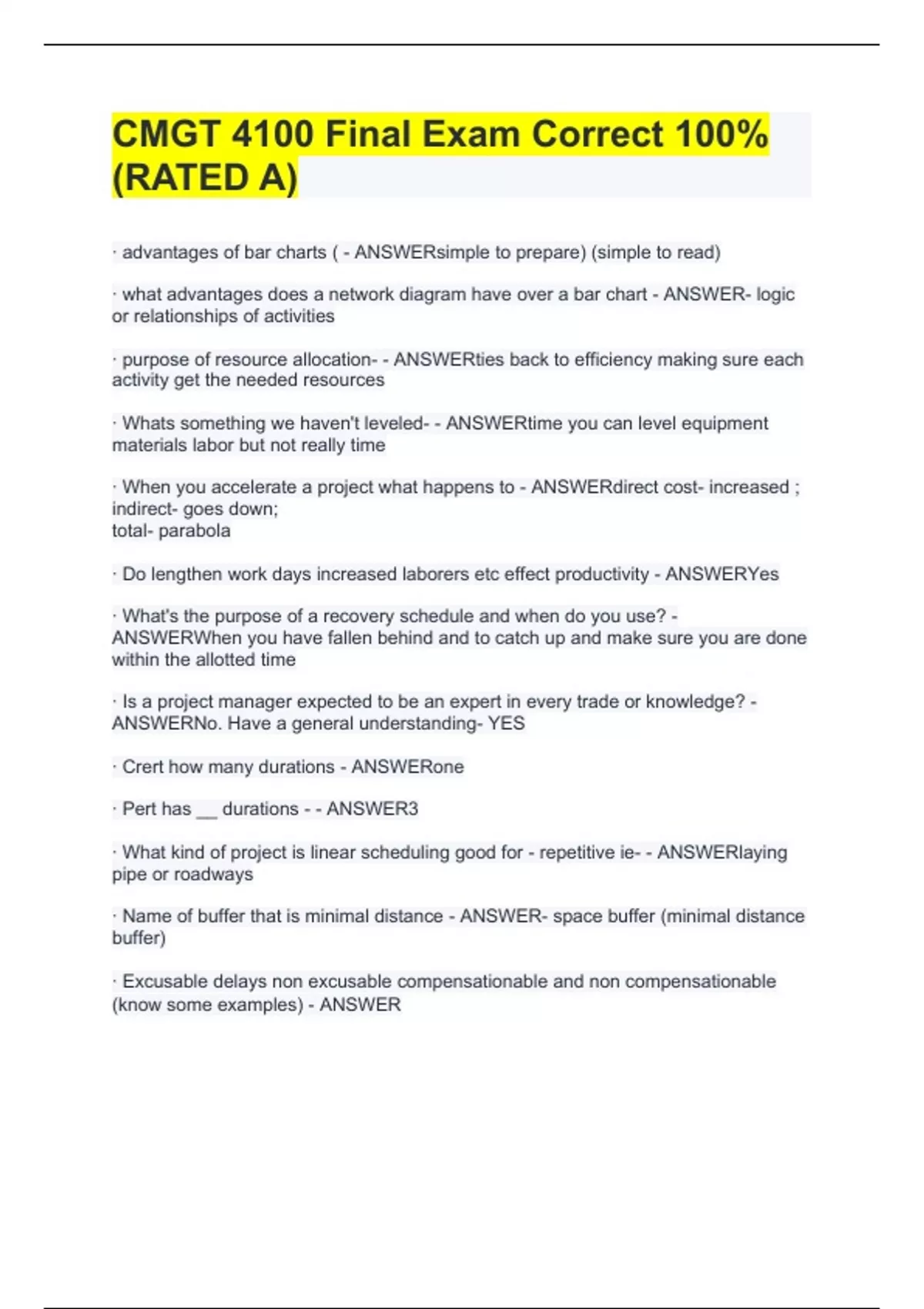 · advantages of bar charts ( - ANSWERsimple to prepare) (simple to read) · what advantages does a network diagram have over a bar chart - ANSWER- logic or relationships of activities · purpose of resource allocation- - ANSWERties back to efficiency making sure each activity get the needed resources · Whats something we haven't leveled- - ANSWERtime you can level equipment materials labor but not really time · When you accelerate a project what happens to - ANSWERdirect cost- increased ; indirect- goes down; total- parabola · Do lengthen work days increased laborers etc effect productivity - ANSWERYes · What's the purpose of a recovery schedule and when do you use? - ANSWERWhen you have fallen behind and to catch up and make sure you are done within the allotted time · Is a project manager expected to be an expert in every trade or knowledge? - ANSWERNo. Have a general understanding- YES · Crert how many durations - ANSWERone · Pert has __ durations - - ANSWER3 · What kind of project is linear scheduling good for - repetitive ie- - ANSWERlaying pipe or roadways · Name of buffer that is minimal distance - ANSWER- space buffer (minimal distance buffer) ·
