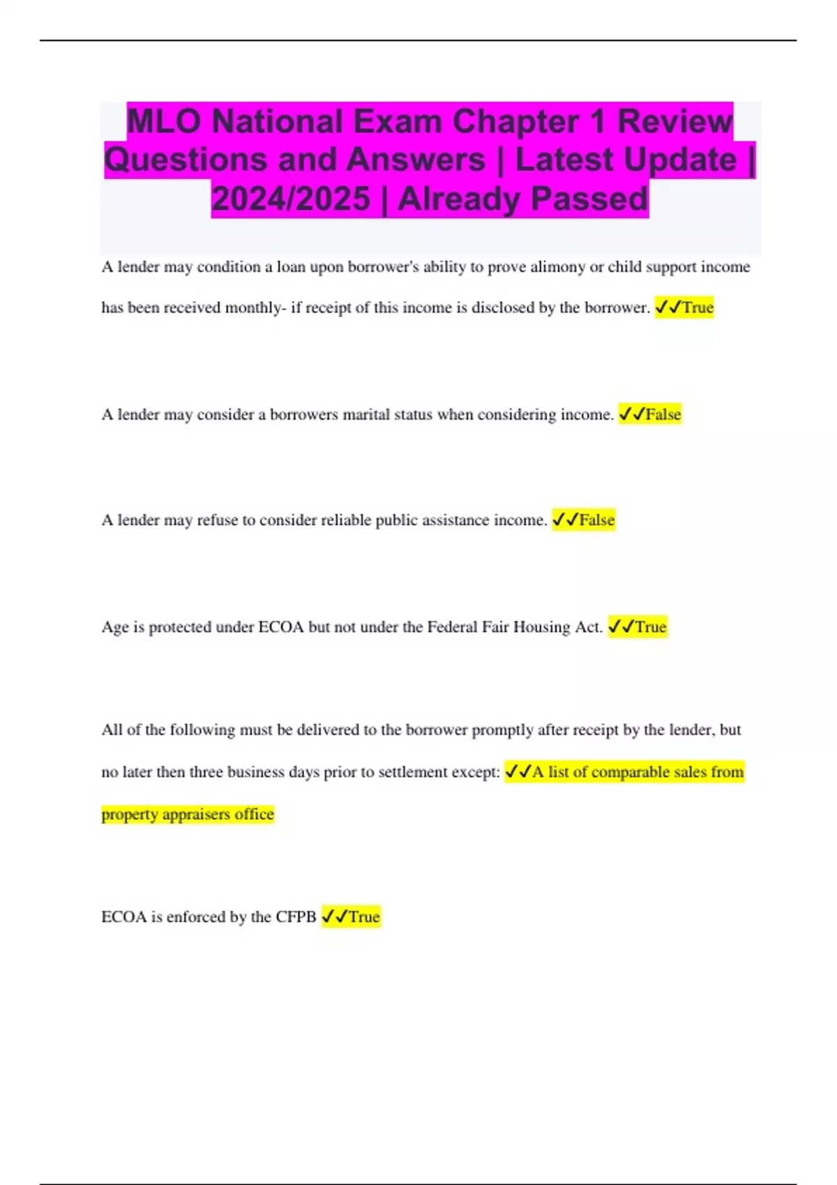 MLO National Exam Chapter 1 Review Questions and Answers | Latest Update | 2024/2025 | Already Passed A lender may condition a loan upon borrower's ability to prove alimony or child support income has been received monthly- if receipt of this income is disclosed by the borrower. True A lender may consider a borrowers marital status when considering income. False A lender may refuse to consider reliable public assistance income. False Age is protected under ECOA but not under the Federal Fair Housing Act. True All of the following must be delivered to the borrower promptly after receipt by the lender, but no later then three business days prior to settlement except: A list of comparable sales from property appraisers office ECOA is enforced by the CFPB True ECOA requires one notice of adverse action be sent to the applicant unless: The decision is based upon information found in the co-borrowers credit report If in a face to face application the borrower refuses to provide the loan originator with the information for government monitoring purposes contained in section X of the 1003 form the loan originator must: Note that fact on the form 1003 Guess on the basis of visual observation A and B ^ If the loan is denied, the lender's notice on adverse action (aka denial letter) must be delivered to the applicant within 30 days. True Once the lender has received a completed application it must render a credit decision within ______ days. 30 The borrower is entitled to a copy of the appraisal report no later than: Three business days prior to settlement The Fair Housing Act of 1968 requires advertisements for mortgage loans containing: The Equal Housing Opportunity logo in each add The slogan "equal housing lender" in each broadcast