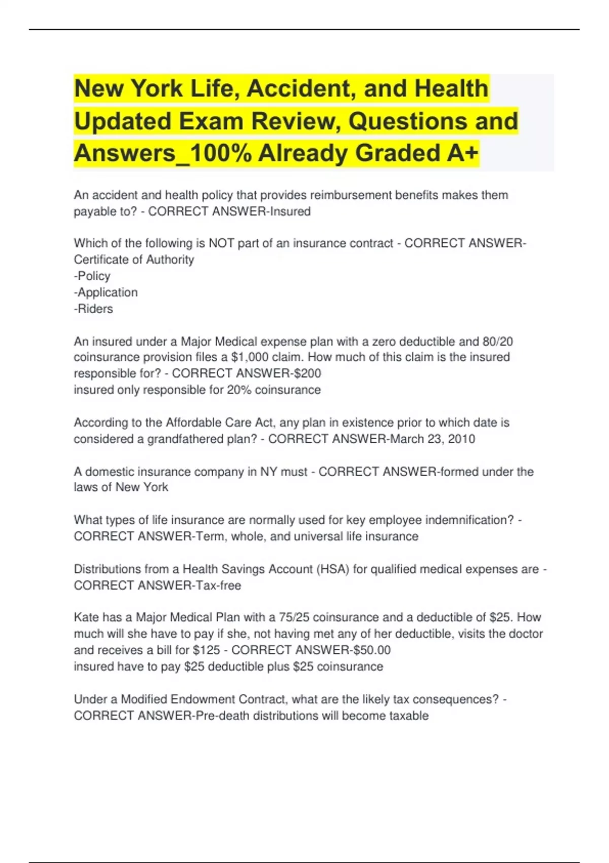 + An accident and health policy that provides reimbursement benefits makes them payable to? - CORRECT ANSWER-Insured Which of the following is NOT part of an insurance contract - CORRECT ANSWER-Certificate of Authority -Policy -Application -Riders An insured under a Major Medical expense plan with a zero deductible and 80/20 coinsurance provision files a $1,000 claim. How much of this claim is the insured responsible for? - CORRECT ANSWER-$200 insured only responsible for 20% coinsurance According to the Affordable Care Act, any plan in existence prior to which date is considered a grandfathered plan? - CORRECT ANSWER-March 23, 2010 A domestic insurance company in NY must - CORRECT ANSWER-formed under the laws of New York What types of life insurance are normally used for key employee indemnification? - CORRECT ANSWER-Term, whole, and universal life insurance Distributions from a Health Savings Account (HSA) for qualified medical expenses are - CORRECT ANSWER-Tax-free Kate has a Major Medical Plan with a 75/25 coinsurance and a deductible of $25. How much will she have to pay if she, not having met any of her deductible, visits the doctor and receives a bill for $125 - CORRECT ANSWER-$50.00 insured have to pay $25 deductible plus $25 coinsurance Under a Modified Endowment Contract, what are the likely tax consequences? - CORRECT ANSWER-Pre-death distributions will become taxable An agent license is NOT required when - CORRECT ANSWER-Referring insurance The taxable portion of each annuity payment is calculated using which method? - CORRECT ANSWER-Exclusion Ratio All of the following are considered to be nonforfeiture options available to a policyowner EXCEPT - CORRECT ANSWER-Reduction of Premium -Extended Term Insurance -Cash Surrender -Reduced Paid-Up Insurance The IRS states that a taxpayer's medical expenses that exceed 7.5% of their adjusted gross income is tax deductible. Which maybe considered a medical expense under this rule? - CORRECT ANSWER-Long Term Care Insurance premiums Under the Affordable Care Act, how would a grandfathered health plan lose its grandfathered status - CORRECT ANSWER-The insurer significantly raises co-insurance charges, deductibles, or co-payment charges Which disability policy provision would address any concerns of the value of the benefits decreasing over time? - CORRECT ANSWER-Cost of living benefit What is the purpose of a Disability Income Benefit? - CORRECT ANSWER-Provide money for living expenses The open enrollment period for Medicare Supplements begins at what age? - CORRECT ANSWER-Age 65 An individual covered under a Blue Cross Blue Shield plan is called? - CORRECT ANSWER-Subscriber Someone needing custodial care at home would require which type of coverage? - CORRECT ANSWER-Long-term Care Which dividend option would an insurer invest the policyowner's money and add any interest earnings as the dividends accrue? - CORRECT ANSWER-Accumulation at Interest Option