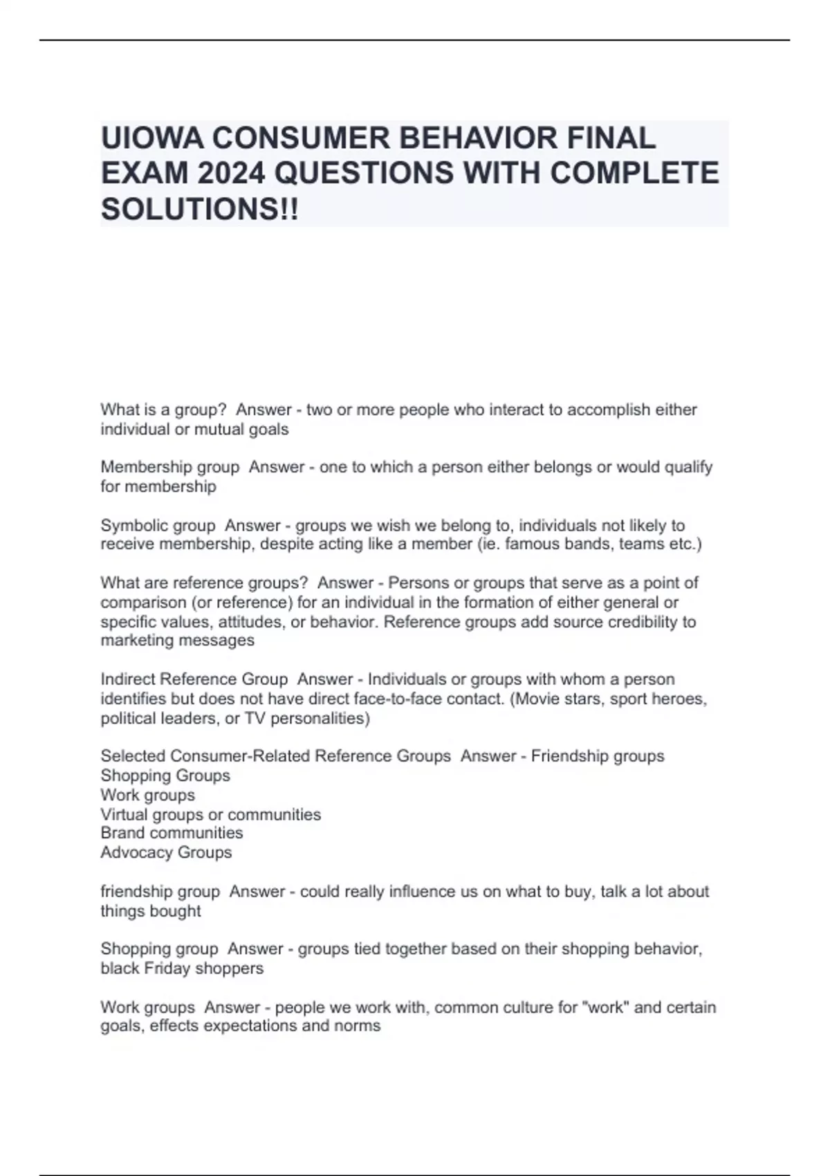 UIOWA CONSUMER BEHAVIOR FINAL EXAM 2024 QUESTIONS WITH COMPLETE SOLUTIONS!!