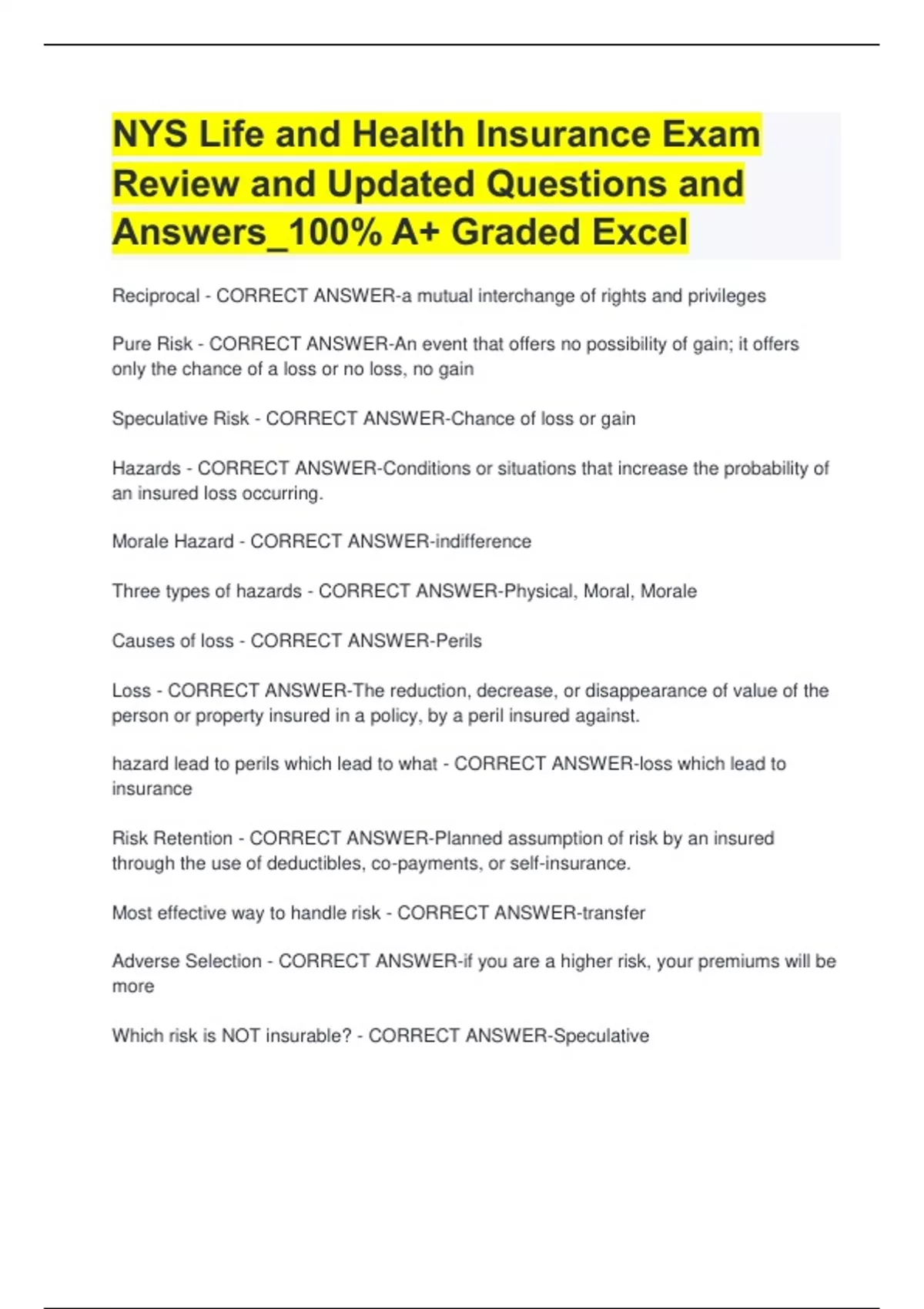 NYS Life and Health Insurance Exam Review and Updated Questions and Answers_100% A+ Graded Excel