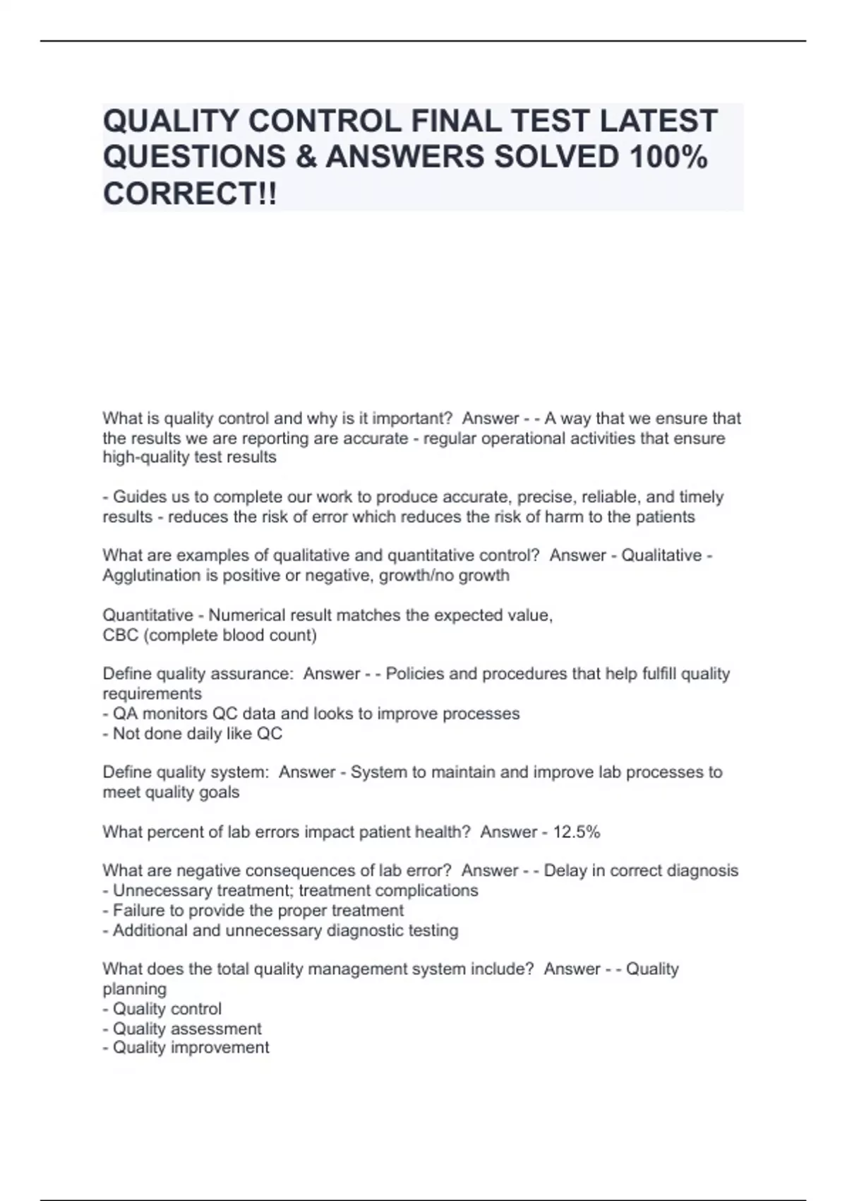 QUALITY CONTROL FINAL TEST LATEST QUESTIONS & ANSWERS SOLVED 100% CORRECT!!