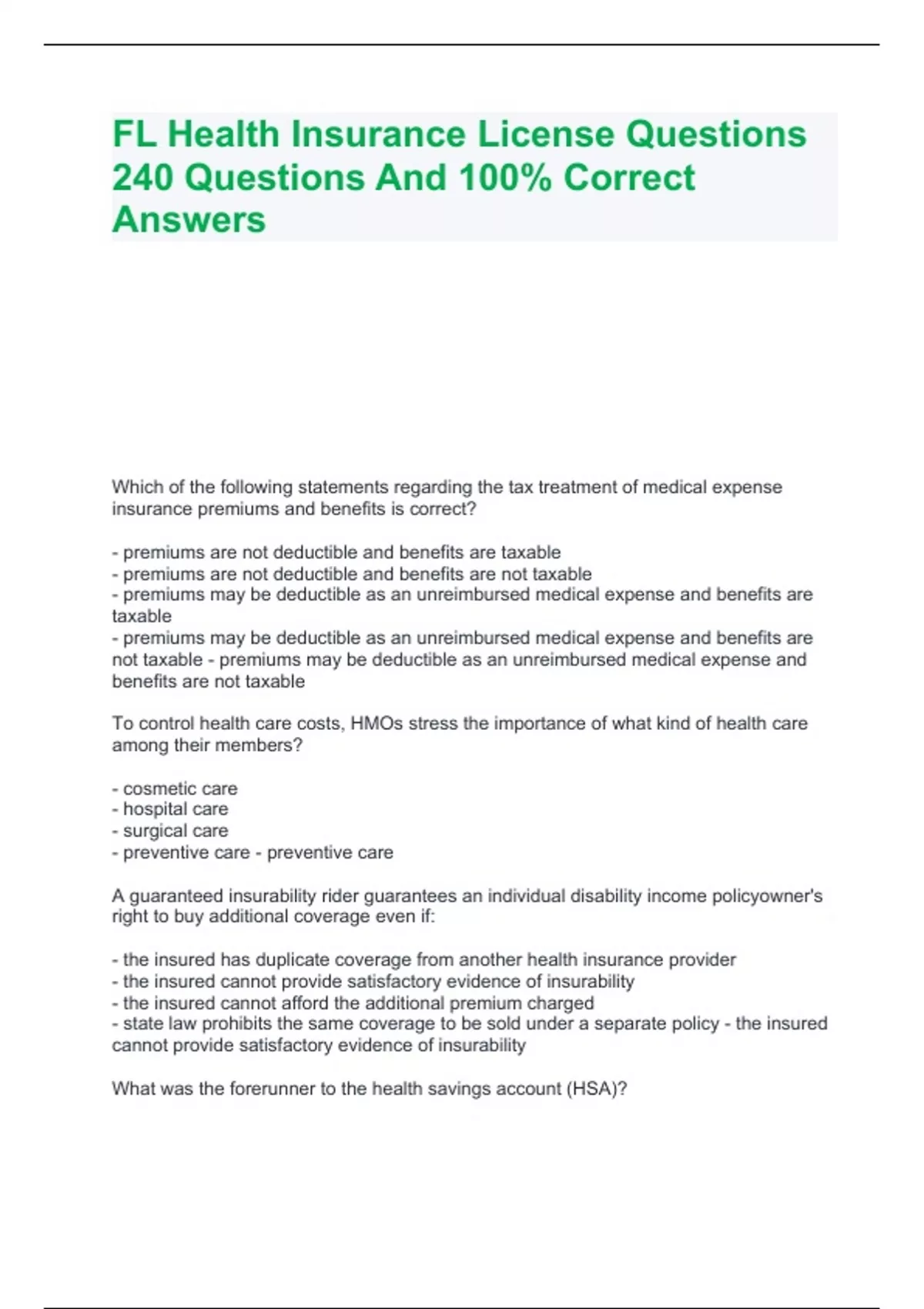 Which of the following statements regarding the tax treatment of medical expense insurance premiums and benefits is correct? - premiums are not deductible and benefits are taxable - premiums are not deductible and benefits are not taxable - premiums may be deductible as an unreimbursed medical expense and benefits are taxable - premiums may be deductible as an unreimbursed medical expense and benefits are not taxable - premiums may be deductible as an unreimbursed medical expense and benefits are not taxable To control health care costs, HMOs stress the importance of what kind of health care among their members? - cosmetic care - hospital care - surgical care - preventive care - preventive care A guaranteed insurability rider guarantees an individual disability income policyowner's right to buy additional coverage even if: - the insured has duplicate coverage from another health insurance provider - the insured cannot provide satisfactory evidence of insurability - the insured cannot afford the additional premium charged - state law prohibits the same coverage to be sold under a separate policy - the insured cannot provide satisfactory evidence of insurability What was the forerunner to the health savings account (HSA)?
