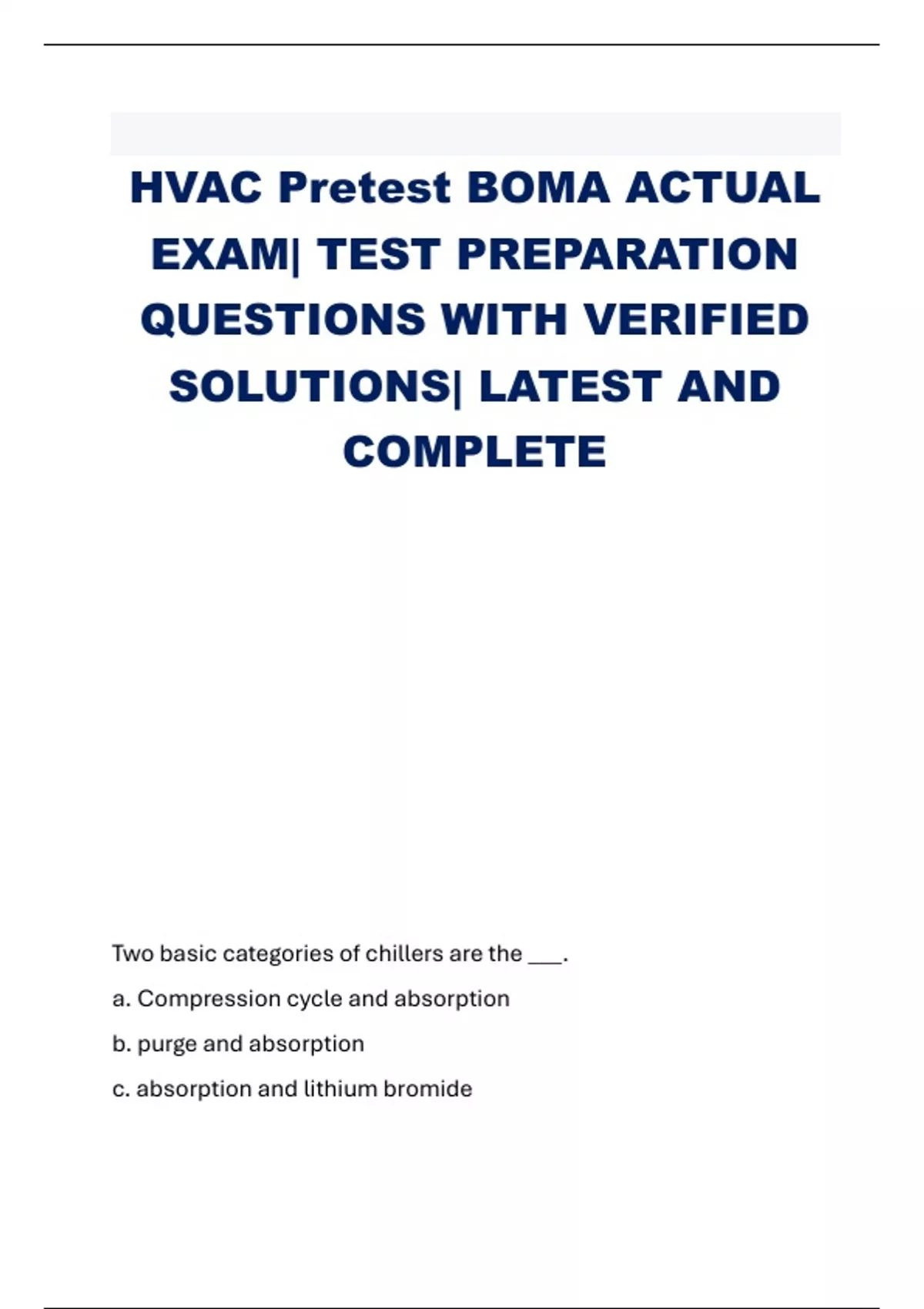 HVAC Pretest BOMA ACTUAL EXAM| TEST PREPARATION QUESTIONS WITH VERIFIED SOLUTIONS| LATEST AND COMPLETE