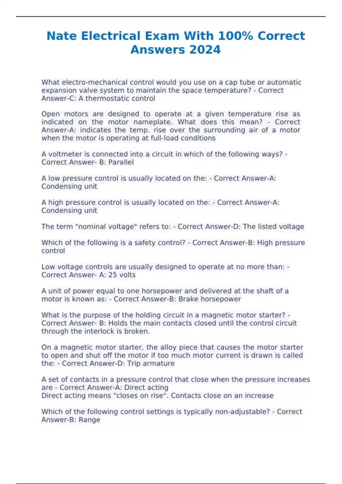 Nate Electrical Exam With 100% Correct Answers 2024 What electro-mechanical control would you use on a cap tube or automatic expansion valve system to maintain the space temperature? - Correct Answer-C: A thermostatic control