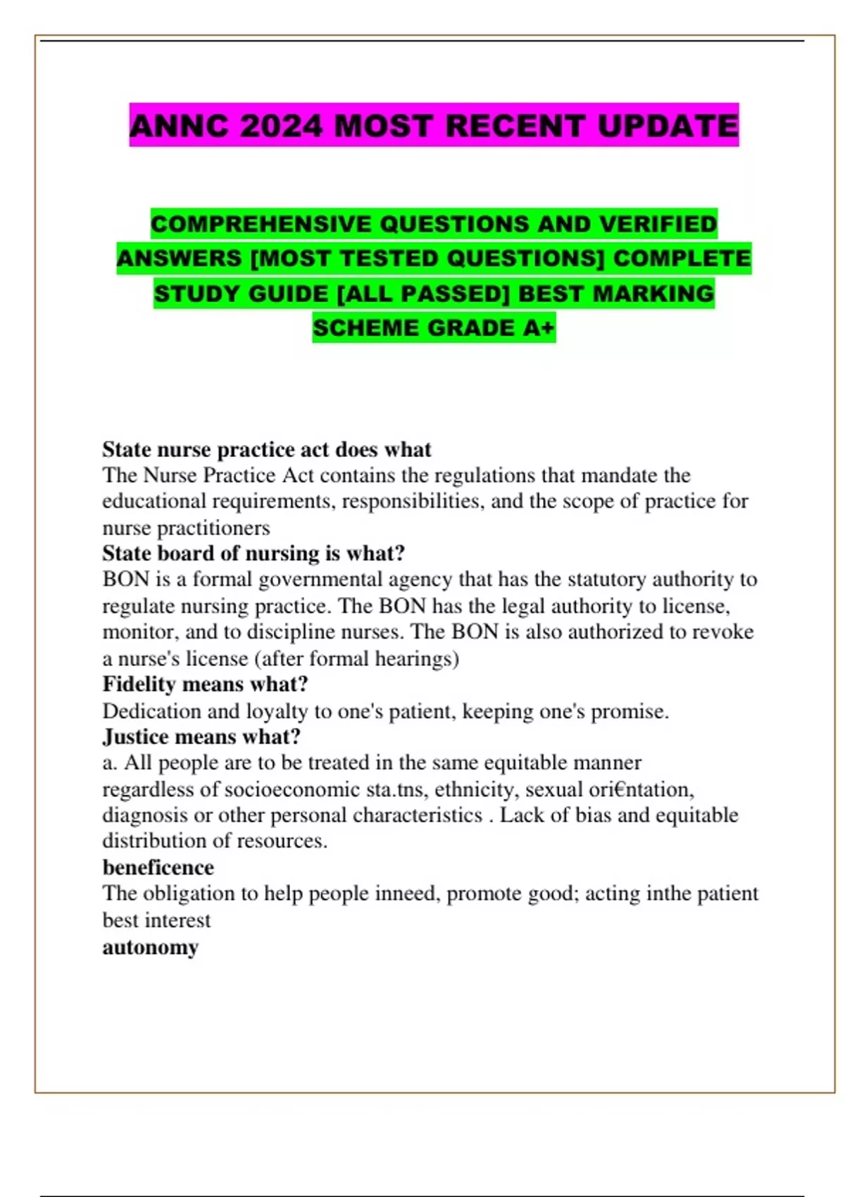 ANNC 2024 MOST RECENT UPDATE COMPREHENSIVE QUESTIONS AND VERIFIED ANSWERS [MOST TESTED QUESTIONS] COMPLETE STUDY GUIDE [ALL PASSED] BEST MARKING SCHEME GRADE A+